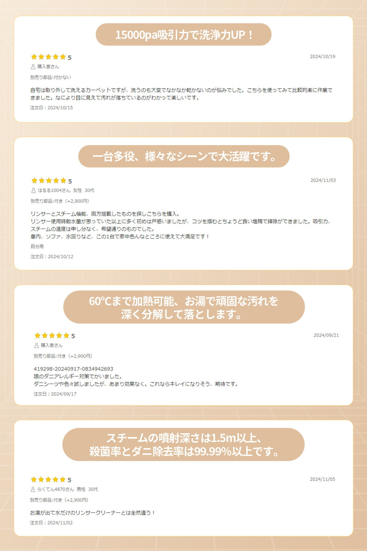 最新版の説明書はこちら ★PSマーク認証PSマークの種類:PSE届出事業者名:株式会社 Victoria ★15000pa吸引力で洗浄力UP★二役一台!カーペット洗浄機とスチーム掃除機、両種類のクリーナーの機能を兼ね備えているYINO Lifeスチームクリーナーが登場します。高出力モーターを搭載しており、最大吸引力は15000paに達し、驚きの洗浄力を実現します。ソファ、カーペット、枕、カーテンなどの布製品以外にも、人形やおもちゃ、キッチンコンロ、バスルームの蛇口など、様々なシーンで大活躍です。 ★大容量タンクを搭載★透明汚水タンクの容量は1.3L、使用量が一目瞭然、清水タンクは1.6Lの大容量なので、頻繁に水を足す手間が省けます。5M超長いコード付き、広い範囲の掃除や、一度にまとめての掃除に便利です。ジュース、おしっこ、足跡や油汚れなどの汚れを効果的で洗浄可能なので、ペットやお子さんがいらっしゃるご家庭、裸足で生活される方、お料理をよくされる方におすすめです。 ★60℃まで加熱可能★瞬間ボイラー加熱技術と内部NCT精密温度制御を搭載しており、約25秒で60℃まで加熱でき、お湯で頑固な汚れを深く分解して落とします。お湯を注ぐ必要がある従来の製品に比べて手間を大幅に節約します。噴射レバーを押すだけで連続噴射可能、大きな汚れも簡単に落とせます。65dB程度の運転音は生活に邪魔になりません。1台で家の隅々まで簡単に掃除できます。 ★選べる4つのモード★冷温クリーナーモード:ジュース、足跡、牛乳の汚れなどのタンパク質の汚れに適しています。高温クリーナーモード:ソースやワインの汚れなどの頑固な汚れに適しています。スチーム吸引モード:ガラスや鏡の汚れ、コンロの油汚れも簡単に取り除きます。スチームモード:スチームの噴射深さは1.5m以上、殺菌率とダニ除去率は99.99%以上です。 ★安全で操作が簡単★音声案内機能を搭載しており、電源を入れると、音声案内が自動的にオンになります。スチームの準備の終了音声案内もでき、使用中の安全性を確保するだけでなく、掃除も楽になります。LEDディスプレイで簡単に操作でき、汚水タンクが満杯になる際、モードを切り替える際には画面上のアイコンが点滅し、音声で案内してくれるので安心、初心者に優しいです。お掃除の効率も大幅にアップします。 ★お手入れや保管が便利★付属の自動洗浄用力バ一を取り付けることでホースを洗浄して、垢や臭いの心配はありません。ワンボタン収納機能を搭載し、収納ボタンを押すだけでホースやコードをに巻き取られて本体に隠れるので、底部に360°キャスターが設置されており、収納や片づけの手間が省け、場所を取らず、部屋のどこに置いてもピッタリです。保管や持ち運びに非常に便利です。 ★安全安心・保証期間★カーペットクリーナーが水で洗浄することで、洗剤や化学薬品は一切不要、人にも環境にもやさしいクリーナーです。本製品は購入日より12ヶ月のサポート・保証を提供いたします。初期不良また他何か問題がありましたら、注文番号を添えて弊社までご連絡ください。 カーペットクリーナー カーペット洗浄機 リンサー 車 掃除機 布 バキュームクリーナー スポットクリーナー カーペット ラグ ソファ 絨毯 布製品 掃除 水で洗う 水掃除 車内 布製品洗浄機 車用品 スチームクリーナー 布団クリーナー クリーナー 布団クリーナー ガラスリンサー 絨毯クリーナー 車 掃除機 シートクリーナー 水垢クリーナー スニーカー クリーナー▼オススメ▼ ▼オススメ▼