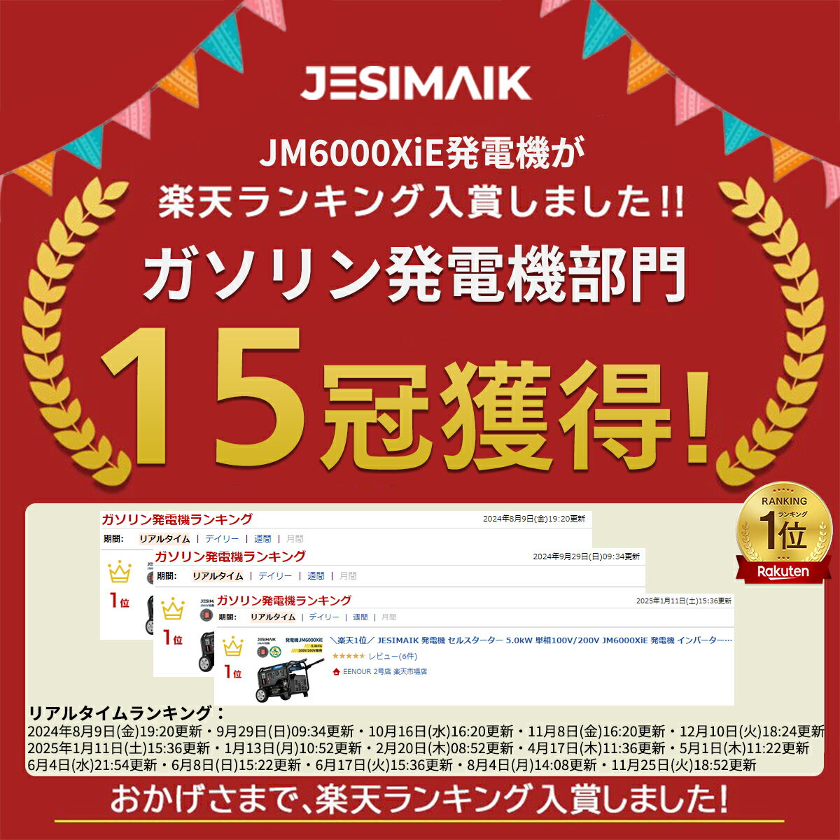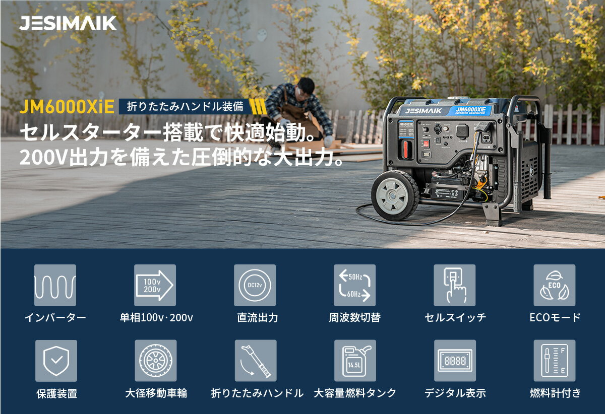 メーカー希望小売価格はメーカーカタログに基づいて掲載しています 商品説明 ■型番 JM6000XiE 発電機(インバーター搭載+オープン型) ■商品仕様 定格出力:5.0kVA 定格周波数:50/60Hz(切替式) ACコンセント:100V/20A(2口)、100V・200V/30A(1口) シガーソケット:12V/8.3A(1口) 連続運転時間:約9.7h~4h(1/4負荷~100%負荷) エンジン種類:312cc空冷4ストロークOHVエンジン 使用燃料:無鉛ガソリン 燃料タンク容量:14.5L エンジンオイル:4サイクル用、粘度SAE10W-30以上 オイル規定量:0.85L 始動方式:セルスタート式/ リコイル式 寸法(全長×全幅×全高):56.5x46.5x45cm 乾燥重量:47kg ■ポイント1 ★プロフェッショナルユースに対応する高出力 JM6000XiE発電機の定格出力は5000Wで、瞬間最高出力は5500Wとハイパワーになり、ほとんどの電気機器を使用することができます。電子レンジやエアコンはもちろん、農業用ドローンなど大型ドローンのバッテリー充電にも対応し、業務用電動工具や工事用機械にも問題なく対応可能で、屋外での長時間業務をサポートします。複数の出力ポートを備えており、多くの電化製品を同時に使うことができます。業務用だけでなく、事務所や病院などに非常時電源としても最適です。 ■ポイント2 ★5kVA大出力で幅広いシーンに JM6000XiEインバーター発電機は单相200Vコンセントを搭載したことで、大型エアコンや業務用機器などの200V機器が利用可能になります。一般的な単相100Vに加えて、単相200Vを同時に出力することができ、5000Wの高出力が得られます(瞬間最大出力は5500W)。3つのACコンセントとシガーソケットが標準装備して、これ一台で様々なシーンに大活躍。業務用だけでなく、事務所や病院などに非常時電源としても最適です。 ■ポイント3 ★セル機能で簡単始動 JESIMAIK発電機独自のセル機能を搭載しており、ワンプッシュで簡単にエンジンを始動できます。また、セル始動用バッテリーが切れた場合でも、リコイルスターターでエンジンを始動することも可能です。リコイルスターターは軽い引き心地で設計されているため、誰でも簡単に引けます。 ■ポイント4 ★移動が楽なキャスター装備 丈夫なキャスターと可倒式ハンドルが付いているので、アウトドアやいざという時に女性や年配の方でもラクラク持ち運べます。日曜大工、出張修理や各種イベントなど、任意の場所に移動して簡単に発電できます。 ※商品到着後、ホイールとハンドルはお客様側でで取り付ける必要があります。 ※ハンドルとホイールは別の梱包に発送されるので、発電機本体との到着時間は異なる場合があります。予めご了承ください。 ■ポイント5 ★低燃費で長時間運転 14.5Lの大容量燃料タンクと燃費効率の良い4ストロークOHVエンジンを搭載したインバーター発電機は、1/4の負荷時には連続駆動時間が9.7時間に達しました。大容量燃料タンクのおかげで給油の頻度が少なく、長時間の使用が可能です。プロユースからDIY、非常時まで幅広い用途に対応します。 ■ポイント6 ★品質管理にこだわれた工場での製造 製品の安定性を追求するため、JESIMAIKの工場は厳しい基準で生産を行い、そして出荷前にエンジン運転を行い、異常がないことを確認します。 ■ポイント7 ★安心保障 本製品は購入日より12ヶ月+12ヶ月(レビュー投稿)のサポート・保証を提供いたします。初期不良その他何か問題がありましたら、注文番号をご用意いただきお気軽にご連絡ください。 ■安全にご使用いただくために ● ご購入時、発電機にはエンジンオイル・燃料は入っておりません。 ● 発電機を使用すると排気ガスが出ます。一酸化炭素中毒の恐れがあるため、屋内、倉庫、車内、井戸、トンネル、タンク内など換気の悪い場所では使用しないでください。 ● ご使用前には、必ず取扱い説明書をお読みください。 ■返品について 商品到着後、商品に問題がある場合、違う商品が届いた場合、返品、交換について、お手数をおかけいたしますが商品到着後7日以内にメール、もしくはお電話にてご連絡下さい。 お客様都合による返品、交換 未開封・未使用のもの(届いた時と同じ状態の商品)は商品到着後7日以内にご連絡をいただいた場合原則対応いたします。 ※返品送料はお客様にご負担いただきます。 ※返送時に着払いは受け取りしかねます、ご遠慮ください。 開封後、商品の初期不良にあたる場合による返品、交換 ※送料・手数料等全て弊社負担にて返品・交換対応をさせていただきます。 ※レビューにて報告いただきますと気づくことができない場合がございます。まずは直接ご連絡をいただけますと幸いです。 (以下のキーワードの興味がある方ぜひ商品ページをご覧ください:JESIMAIK 発電機 インバーター発電機 発電機 インバーター 発電機 家庭用 小型 小型発電機 防災 発電機 キャンプ ガソリン発電機 本田 ヤマハ 自家発電 発電器 発動 ポータブル発電機 JM1800Xi JM4000Xi JM6000XiE 200V 100V 単相 屋外作業 アウトドア レジャー キッチンカー 移動販売 BBQ バーベキュー ガーデニング DI