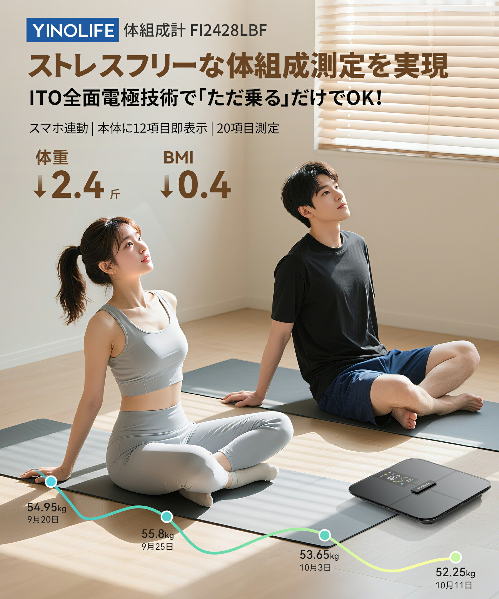 【最安値挑戦!82%OFF】YINOLIFE 体組成計 体重計 25項目計測 アプリ連動 Bluetooth/WiFi対応 デジタル 薄型 ヘルスメーター スマホ連携 体脂肪率/内臓脂肪/筋肉率/基礎代謝量/BMI/体年齢 健康づくり 体重管理 自動認識 ITO測定面 FI2428LBF