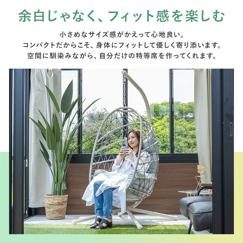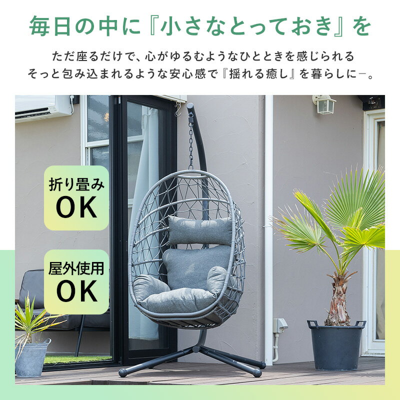 ハンギングチェア 1人掛け バスケット 吊り下げ リラックス たまご型 人工ラタン クッション ヘッドレスト 固定バンド モダン リゾート リビング ガーデン バルコニー ガーデンファニチャー 屋内外両用