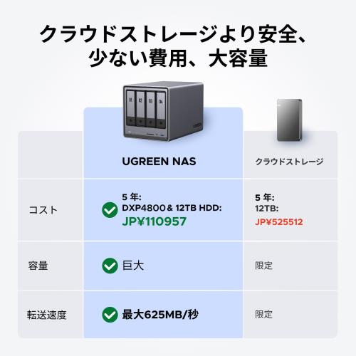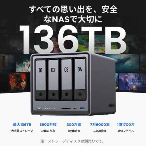 外付けドライブを超える高性能保存ツール: NASは、集中型ストレージ、自動バックアップ、リモートアクセス、多様なRAIDパターンを提供し、ドライブが故障した場合でも簡単にデータを復旧できます。 大容量ストレージで限界を突破: 最大136TBの容量で、約3900万枚の写真や76,000本の映画を保存可能。容量不足の心配を解消します。! 超高速データ転送: 2つの2.5GbEネットワークポートまたは10Gbps USBポートを使用すれば、1GBのデータを2秒以内にバックアップ可能。 安全なプライベートクラウド: 高度な暗号化でファイルを保護し、データの100%所有権を保持します。柔軟な権限管理により、他者との共同作業時もプライバシーを保護します。 AI搭載フォトアルバム: 顔・風景・物体・場所を認識して写真を自動的に整理します。また、重複画像の瞬時削除で、貴重なストレージ空間や管理時間を大幅に節約します。 使いやすいアプリ:多くのアプリをダウンロードする必要はなく、よく使う機能は全てUGREEN NASアプリに集約されています。ストレージ・マネージャー、ファイル、写真など、すべて1つのところからアクセスできます。また、Windows/macOS/Android/iOS/ブラウザ/スマートTVに対応。シンプルな設定でどのデバイスでも安全にファイル共有できます。 幅広い互換性: ウエスタンデジタル、シーゲート、東芝などサードパーティ製HDDに対応(※互換性リスト要確認)。ストレージ用ハードドライブは別途購入が必要です。 2年間の製品保証付き: お客様が製品を購入された時点から24ヶ月後の応当日まで保証いたします。UGREENの2年間保証で、安心してお使いいただけます。