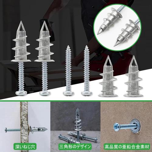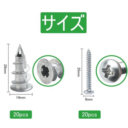 セット内容石膏ボード用アンカー20個とネジ20本が含まれています。この信頼性の高いセットで、装飾品や器具をしっかりと固定し、住空間をより美しく演出できます。 高い強度と耐久性高品質な亜鉛合金素材を使用しており、ネジとアンカーが強力かつ安全に固定でき、重いものもしっかり支えます。亜鉛素材はナイロンやプラスチック素材よりも耐久性に優れています。 簡単取り付けセルフドリルアンカーの先端を石膏ボードに差し込み、ねじ山がボードに食い込むまで押し付けながらねじ込みます。アンカーが石膏ボードと面一になるまで押し込み、最後にネジを差し込んでしっかり固定してください。 幅広い用途セルフドリル式壁プラグは、石膏ボード壁や乾式壁に最適です。額縁の吊り下げ、天井フック、DIYリフォーム、石膏ボード用ネジ、石膏補修、鏡の固定など、さまざまな用途にご利用いただけます。 注意事項ネジをチューブの端まで締め込むと、ネジがチューブを貫通し、先端部分が押し広げられます。これは正常な現象で、石膏ボードにより密着して固定されるためです。