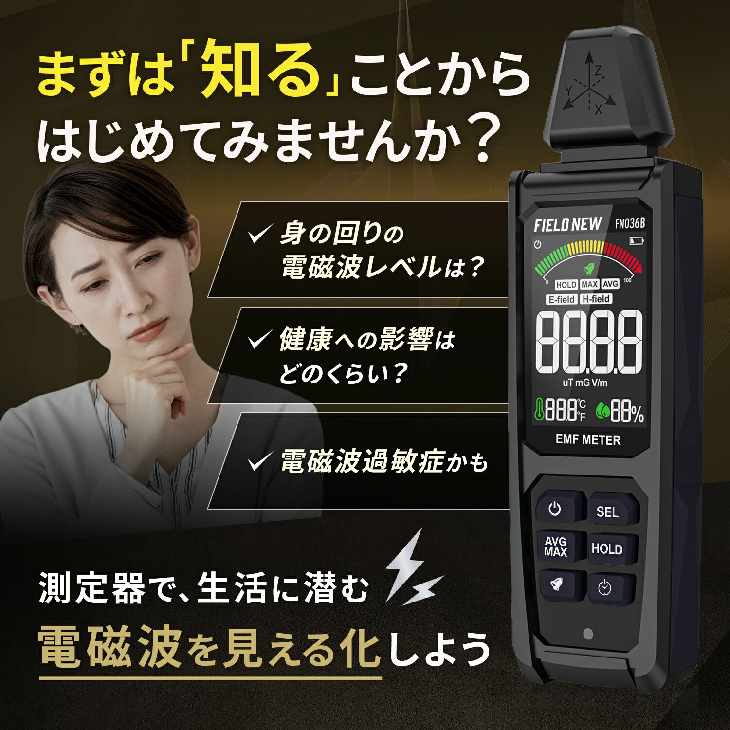 【4 in 1電磁波測定器】 これ1台で「電界・磁界・温度・湿度」の4項目を同時に測定可能。 テレビや冷蔵庫など、身の回りの家電製品が発する電磁波を可視化できます。 さらに温度・湿度もあわせて確認できるため、室内環境を総合的にチェックしたい方にもおすすめです。 3軸センサーを採用しており、全方位の電磁波をリアルタイムで測定できるため、より高精度かつ実環境に近いデータを取得できます。 【高周波は非対応】 本製品は高周波(RF)には対応していません。 Wi-Fiルーターや5G対応スマートフォン、Bluetooth搭載機器、スマート家電などの高周波電磁波は測定できません。 高周波測定をご希望の方は、上位機種「FieldNew 5 in 1電磁波測定器」をご検討ください。 【3軸センサー採用】 〈全方向測定〉X・Y・Zの各軸方向の電磁波を同時に測定し、総合的な強度を算出。 〈高精度〉単軸測定器に比べ、全体の電磁波強度を正確に評価できるため、測定精度が向上。 〈使いやすさ〉測定器の向きを細かく調整する必要がなく、迅速かつ簡単に測定できます。 【高精細VAディスプレイ】 視認性に優れたVAディスプレイを採用。暗い室内でも明るく見やすい設計です。 3.3インチの大型画面で数値が大きく表示され、温湿度の同時表示にも対応。 さらにカラーメーター付きで、測定値の強弱を直感的に把握できます。 【ずっと使える充電式】 1000mAhの大容量バッテリーを内蔵し、電池交換不要で長期間使用可能。 USB Type-C充電に対応しているため、スマートフォンやPCなどから手軽に充電できます。 【初心者でも簡単操作】 A4両面カラーの日本語マニュアル付きで、誰でも簡単に操作できます。 初めての方でも安心してお使いいただけるよう、動画で測定手順を視覚的に解説。 より分かりやすく操作を習得できます。 【1年間の交換保証】 ご注文後1年以内に万が一製品に不具合が発生した場合は、初期・使用後を問わず新品に交換いたします。 また、製品の不具合や使い方に関して不明点がある場合は、公式LINEにて専門技術スタッフが迅速に対応いたします。