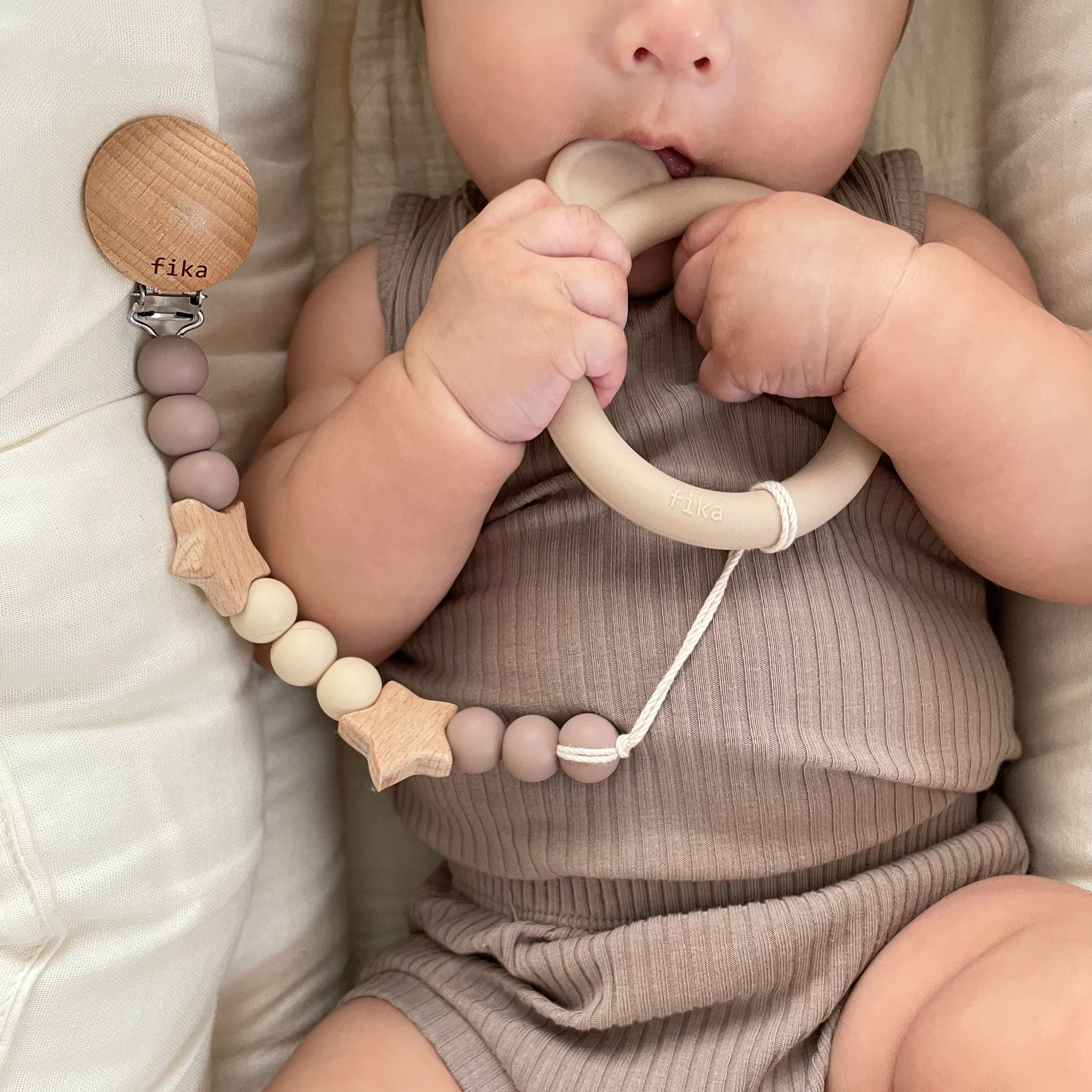 生産地パーツ…中国 製造/パッケージ…日本サイズ〈ホルダー〉 全長約30cm(クリップ部分含む) 〈シリコーン歯固め〉 直径 約9cm 厚さ1.2cm 内径約6.5cm素材シリコーンゴム…(BPAフリー・フタル酸エステル等の環境ホルモンを含まない) 紐…コットン100% クリップ…ステンレス・天然木(無塗装・無着色の天然木製)注意事項〈ホルダー〉 ・クリップは分厚いものを無理に挟むと破損する恐れがありますのでご注意ください。 ・シリコーンはホコリなどが付着しやすいので、ご使用前にウエットティッシュなどで拭いて下さい。 ・赤ちゃんの力に耐えられるよう注意して作製しておりますが、強い力が加わったり、長期の使用でビーズが外れてしまう危険があります。必ず保護者様の目の届くところでのご使用をお願いいたします。 ・思わぬ事故の原因となりますので、傷や亀裂が生じた場合には、ご使用を中止してください。 ・ビーズの誤飲を防ぐため、ホルダーには必ず歯固めやおもちゃをつけた状態で保管してください。 ・ケガの危険がありますので、クリップ部分は口に入れないようにご注意ください。 〈シリコーン歯固め〉 ・シリコーンはホコリなどが付着しやすいので、ご使用前にウエットティッシュなどで拭いて下さい。 ・必ず保護者様の目の届くところでのご使用をお願いいたします。 ・思わぬ事故の原因となりますので、傷や亀裂が生じた場合には、ご使用を中止してください。 ・お使いいただくにあたり問題はございませんが、製造工程における、小さな黒い点やシリコーンのバリがついている場合がございます。お手入れ方法〈ホルダー〉 ・ご使用後はウエットティッシュ等で汚れを拭き取り、十分に乾かしてください。 ・濡れたままで放置するとカビやサビの原因となりますのでご注意ください。 〈シリコーン歯固め〉 ・水洗い可 ・煮沸消毒可・・・沸騰したお湯に3~5分目安で入れ消毒してください。 ・食洗機の洗浄可 ・薬剤の消毒可・・・哺乳瓶用の薬液を使用することが可能です。 ・電子レンジ消毒・・・専用ケースに入れて消毒してください。各種機種によりお時間を確認してください。 洗浄後は乾いた状態で保管してください。 (シリコーン商品は-20℃から220℃までの耐熱性がありますので、熱に強く、清潔にご使用いただけます)カラー展開全2カラー ・beige(ベージュ) ・cream(クリーム)fikaの商品についてfika(フィーカ)の商品は保育士ママ監修。 保育士だからこそわかるママの気持ちに寄り添った商品作りをしています。 fikaで販売している商品は、赤ちゃんが使う商品すべて、日本の厚生労働省登録検査機関にて、食品衛生法(食品、添加物等の規格基準)の試験を受け、クリアしたものを販売しています。【gift set】holder×BEAR teether (歯固め)かわいい星のビーズが入ったホルダーと大人気のくまの歯固めがセットになりました。 商品はfikaオリジナルポーチ入りで、ギフトにもぴったり! 【ホルダー】 神戸のママが一つ一つハンドメイドで作製しています。 ホルダーは、大切なオモチャやおしゃぶり、歯固めがいつでも赤ちゃんの手に取りやすく、落下から守ってくれる商品です。 先端に歯固めやおしゃぶり、お気に入りのおもちゃなど付けて、反対のクリップを赤ちゃんのお洋服等に付けて使用してください。 薄い部分であれば、ベビーカーにつけていただく事も可能です。 お出掛けの時にお気に入りのおもちゃが落下して紛失してしまうこともなく、落ちて不衛生になることを防ぐことができます。 【歯固め】 Bear teetherは2色のfikaオリジナルカラー(cream / beige)で作製しています。 表面はスムース、裏面はボコボコとしていて、可愛い歯茎やはじめての歯にもほどよい刺激があります。 〈歯固めを使ういい所とは...〉 ・歯のムズムズを解消! ・乳児成長のサポート! ・口をモグモグする練習! 歯固めは、乳歯が生え始める少し前から使うのがおすすめです。 よだれの量が増えたり、ぐずりが増えたり、歯茎に不快感があるサインをチェックしてみてください。 使用しているシリコーンパーツは、BPAフリー・フタル酸エステル等の環境ホルモンを含まないパーツです。 厚生労働省認定の検査機関で検査し、食品衛生基準をクリアしていますので、赤ちゃんに安心してお使いいただけます。 color(歯固めは選べる2カラー)↑cream(クリーム)↑beige(ベージュ)使用イメージセットになっているので、両方すぐに使えて、ギフトにもとてもおすすめです♪(別売り)ギフトラッピング 関連商品はこちらfika baby ball ×holder セット ギフ...fika baby ball ×holder(simple)セッ...fika 木製 歯固め × holder セット ポ...【fika gift set】ポーチ付き holder×...