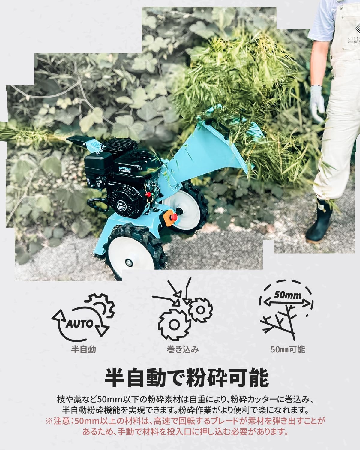 ◎NEW小型ウッドチッパー◎ 木材、枝、竹、などが楽々粉砕でき、竹や木材を粉砕するのに最も効果的なエンジン粉砕機。 超強力7.5馬力エンジン搭載し半自動粉砕機能実現可能です。 竹は75mm粉砕でき、断面100mm粉砕可能(実測値)。 木材の粉砕75mm可能で農業、造園業、果樹園業、各自治体はもちろん、一般ご家庭や小学校など公共機関でも大活躍! ◎ユニークな設計◎ COY-704Mが高強度材料で製造されており、kareyou特有の色・特許も取得しています。 小型シュレッダーであるため、全体の乾燥重量は47kgで、堅固な二つの車輪だけで9kgあります。 大きなサイズの車輪は動かす時に力を省ける上、道路の制約を受けずに泥道でも移動可能です。 165cmの身長にも合う二つのハンドルが装備されており、簡単に移動できます。 さらに、実心の支え足(防振マット付き)が装備されているため、機械が動作する際の振動頻度が低減されます。 ◎排出角度を自由に変更◎ 必要に応じて好きな角度や向きが変えられます。排出口が75°転換可能のため、 遠くへ飛ばしてトラック荷台に直接排出することや、そのまま肥料散布をすることができます。 kareyou専用収納袋(別売り)もっと便利だと思います。 また集積袋に集められる粉砕物はゴミ処理にラク、燃料にも役に立ちます。排出したいところへ飛ばせます! ◎ポータブルで取り外し可能で、メンテナンスが便利◎ エンジンウッドチッパーCOY-704M本体は組み立てる必要があり、旧型粉砕機とは異なり、 本体を取り外すことができましてブレードを交換して残留材料をクリーニングする方が簡単です。 ◎足踏み式緊急停止ボタン付き◎ エンジン粉砕機COY-704M本体は安全ボタンが付いて非常時に踏むと止まりますが ※再起動する場合は必ず安全ボタンをリセットしなければなりません。 投入口には飛散防止用のゴム皮が装着されており、粉砕時にも飛散しません。 ◎家庭ゴミとして処理可能◎ 粉砕能力は優秀で、投入した木材はあっという間に細かなチップ状になります。 可燃ごみとして出すことは可能になり、野焼き禁止の難関を突破します! 【製品仕様】 型番 :COY-704M 定格出力 :7.5馬力 空冷4サイクルエンジン 排気量 :212cc 燃料 :レギュラーガソリン 燃料タンク容量 :3.6L エンジンオイル SAE :10W-30/API SJ/API SL エンジンオイル容量 :0.6L 始動方式 :リコイルスターター式 点火プラグ :F7TC 粉砕能力 :最大77mm 対応素材 :木 / 枝 / 竹等々 乾燥重量 :47kg 本体サイズ :1180*500*830mm 梱包サイズ :750*600*490mm 【注意事項】 ※粉砕可能な枝径は材の硬さ・曲がり具合・繊維の密度などで変わります。 ※粉砕できない物 ビニール ・ ペットボトル ・ 空き缶 ・ 鉄製品 ・ 紙類 ・ 発砲スチロール ※土の付いた草などはミル内部にこびりつく為、粉砕できません。 ※粉砕物に石などが含まれている場合、刃が欠けたり、割れたりします。 ※金属、ボトル、カンやその他異物は、本機の中に絶対に入れないでください。 ●商品は新品であっても、輸入品につき、多少の傷、汚れなどがある場合がございます。過度に神経質な方の購入はご遠慮下さい。 ●万が一当店の在庫管理不行き届きにより在庫切れとなりました場合は、大変申し訳ございませんがお詫び申し上げます。予めご了承ください。 ■本商品を使用した際に発生したトラブル、事故につきまして、当社は一切の責任を負いません。 ご使用に関しましては、全て自己責任にてお願い致します。 ■ご使用前に、必ず取扱い説明書をご確認の上、十分理解して本機をご使用下さい。 ■設置場所に、搬入可能かどうか、間口、廊下、エレベーター等のサイズなどは、必ずご確認下さい。 ■配送後のキャンセルは、一切お受け出来ません。よくご検討された上で、ご購入下さい。 ●商品到着時にはその場で開封し、破損の有無を確認ください。破損の場合には受け取り拒否を配送業者にお申し出ください。 ●お客様による取付作業による損害や、使用上の損害についても責任を負いかねますので、予めご了承の上入札してください。 ●デザイン・色などは入荷時期により変更になる場合がございます。 ●プレゼント発送などの梱包は行なっておりません。 ●梱包はできるだけ簡易包装を行なっておりますので、予めご了承ください。 ※改造/本来の目的以外/強い衝撃などはお控え下さい。 ※仕様は入荷時期により予告なく変更する場合があります。 ※ディスプレイ画面等の環境上、写真と実際の商品の色とは多少違う場合がございます。 ※海外輸入商品により、軽い汚れ/ダメージ等がついている場合がございます。 ○以上、ご同意の上ご購入ください!○