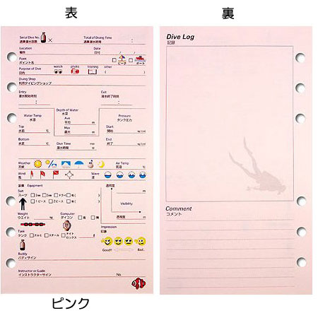 【仕様】6穴 36枚/36ダイブ分 【サイズ】B6版(約170mm×97mm) カラー:ピンク、ブルー、イエロー、グレー、ホワイト。 可愛い魚が描かれているログレフィルです。 楽しいログ付けをさらに楽しく! 表面にダイビングデータ、裏面にコメント欄 1枚で1ダイブ分が書き込めるタイプ ※画像は商品イメージです。 実際とはイメージが異なる場合がございます。 ●楽天ランキング入賞● 人気商品 海楽ログ 【KAIRAKU LOG 3穴】 Aタイプ Bタイプ Cタイプ 表裏両面に 1DIVE分ずつのデータが書き込め、 レフィル1枚で2DIVE分記録できます。 24枚入り(48 DIVE分) カラー:ピンク、ブルー 見開き2ページで1DIVE分の データがしっかり書き込めます。 24枚入り カラー:ホワイト、ブルー 表面にダイビングデータ、 裏面にコメント欄、レフィル1枚で 1DIVE分のデータが書き込めます。 24枚(24 DIVE分)入りカラー:ピンク、ブルー 6穴タイプ 6穴タイプ 6穴タイプ 6穴クリアファイル 表面にダイビングデータ、 裏面にコメント欄、レフィル1枚で 1DIVE分のデータが書き込めます。 36枚入り(36 DIVE分) サイズ:9.6cm×17cm 表面にダイビングデータ、 裏面にコメント欄、レフィル1枚で 1DIVE分のデータが書き込めます。 40枚入り(40 DIVE分) サイズ:9.5cm×17cm シンプルで使いやすい 水辺にも気軽に持ち運べる サイズ:12.5cm×19.5cm×2.5cm レフィルは別売りです。 スキューバダイビング用ログブックレフィル