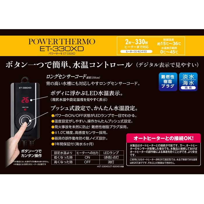 『商品説明』 ボタン一つで簡単、水温コントロール 淡水・海水両用 2W〜330Wヒーターまで対応(ヒーターコンセント1口) オートヒーター(別売)との接続OK! パワーのON/OFF状態がLEDランプで一目でわかる。 温度設定がしやすい。操作かんたんプッシュ式設定。 発火事故を未然に防止! 難燃性樹脂プラグ採用。 ±1.0℃精度。高感度センサー採用。 器具の誤作動を防ぐ耐ノイズ設計。 1年間保証付(海水:6ヶ月) 『個装サイズ』 W80×D75×H170 『制御温度』 約15℃〜36℃ 『水温表示範囲』 0℃〜45℃ ※リニューアル等により予告なくパッケージ、仕様等の変更がある場合がございます。予めご了承ください。