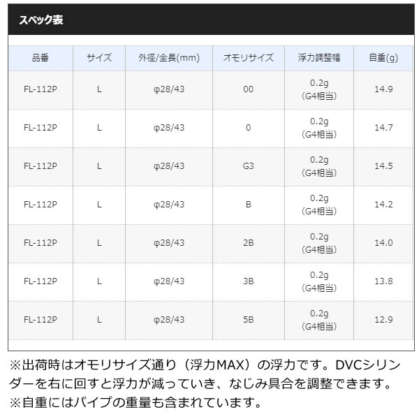 シマノ ファイアブラッドゼロピットDVCA L OR FL-112P (フカセウキ)■外径/全長(mm):φ28/43■オモリサイズ:00~5B≪シマノ フカセウキ≫●オールラウンドに使えるドングリ形状のTYPE-A(M、Lサイズ)。ヘッドカラーはオーソドックスなオレンジと、濃い色の潮や朝夕マヅメなどでも視認性の高いマスカットの2色を設定。※DVCシリンダーは製造の都合上、販売途中から完全に抜けてしまわない仕様に変更しております。完全に抜けない物は緩めると空回りし、それ以上抜け出してきませんが異常ではありません。※出荷時はオモリサイズ通り(浮力MAX)の浮力です。DVCシリンダーを右に回すと浮力が減っていき、なじみ具合を調整できます。※自重にはパイプの重量も含まれています。「在庫有り」の表示であっても、必ずしも在庫を保証するものではありません。掲載商品につきましては、各モール及び実店舗と在庫を共有しております。完売や欠品の場合は、誠にご迷惑をお掛けいたしますが、誠にご迷惑をお掛けいたしますが、予めご了承ください。なお、「ご注文内容の確認とお届けについてのお知らせ」メール送信後は、キャンセルを承ることが出来かねますのでご了承ください。。回せば変わる「瞬速」浮力調整。DVC(ダイビングコントロール)