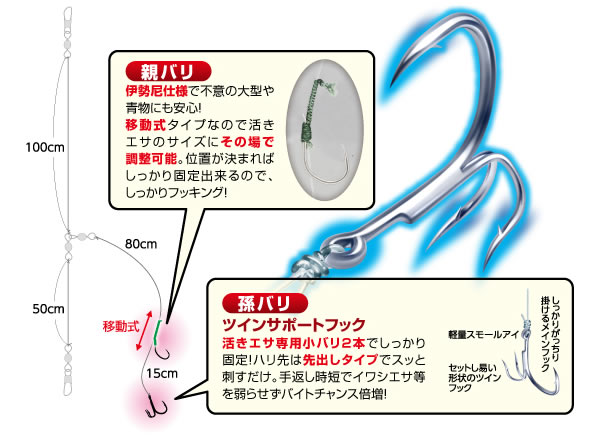 オーナー ツインサポート船ヒラメ 36284 (胴突仕掛け)■入数:1組≪オーナー 胴突仕掛け≫●海域を選ばない基本仕様!【親鈎】:伊勢尼仕様で不意の大型や青物にも安心!移動式タイプなので活きエサのサイズにその場で調整可能。位置が決まればしっかり固定出来るので、しっかりフッキング!【孫鈎】:ツインサポートフック活きエサ専用小バリ2本でしっかり固定!ハリ先は先出しタイプでスッと刺すだけ。手返し時短でイワシエサ等を弱らせずバイトチャンス倍増!「在庫有り」の表示であっても、必ずしも在庫を保証するものではありません。掲載商品につきましては、各モール及び実店舗と在庫を共有しております。完売や欠品の場合は、誠にご迷惑をお掛けいたしますが、御注文をキャンセルさせていただく場合がございます。予めご了承ください。なお、「ご注文内容の確認とお届けについてのお知らせ」メール送信後は、キャンセルを承ることが出来かねますのでご了承ください。この商品のサイズは10、重さは20です。こちらのサイズが合計で100以下、且つ重さが700以下であれば、ゆうパケットで発送できます。この商品のみのご注文の場合、ゆうパケットでの配送時には合計で10個まで入ります。瞬時に決まるツインサポートフック搭載の移動式ヒラメ仕掛
