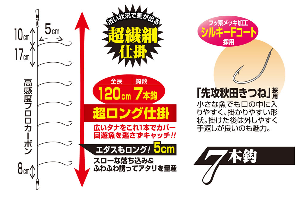 カツイチ スーパーロング きつねセブン LFK-7 (仕掛け)■フロロカーボンハリス:幹糸0.2号/エダス0.15号■全長:120cm■エダス:5cm■7本鈎≪カツイチ 仕掛け≫●めまぐるしくタナが変化し、仕掛の上げ下げでは対応できない状況でも、広範囲をカバーし回遊ワカサギをキャッチできる超ロング7本鈎仕様。●オモリ負荷だけでも掛かりやすい攻撃的フック「先攻秋田きつね」採用。●極細フロロ、留め無し、フッ素コート加工等、贅肉をそぎ落としたフィネス(繊細・技巧)仕様。※内容量・パッケージ等の仕様は、予告なく変更になります。悪しからずご了承下さい。●「在庫有り」の表示であっても、必ずしも在庫を保証するものではありません。掲載商品につきましては、各モール及び実店舗と在庫を共有しております。完売や欠品の場合は、誠にご迷惑をお掛けいたしますが、御注文をキャンセルさせていただく場合がございます。予めご了承ください。●商品画像は代表画像の場合もございます。商品名等をご確認の上ご購入ください。また、仕様変更により商品スペックやパッケージ、内容量などが変更となる場合がございます。仕様変更に伴う返品、商品交換の際の往復送料はお客様ご負担となります。予めご了承ください。この商品のサイズは5、重さは15です。こちらのサイズが合計で100以下、且つ重さが700以下であれば、ゆうパケットで発送できます。この商品のみのご注文の場合、ゆうパケットでの配送時には合計で20個まで入ります。広く探って掛ける!攻めのきつね鈎、超ロング仕掛