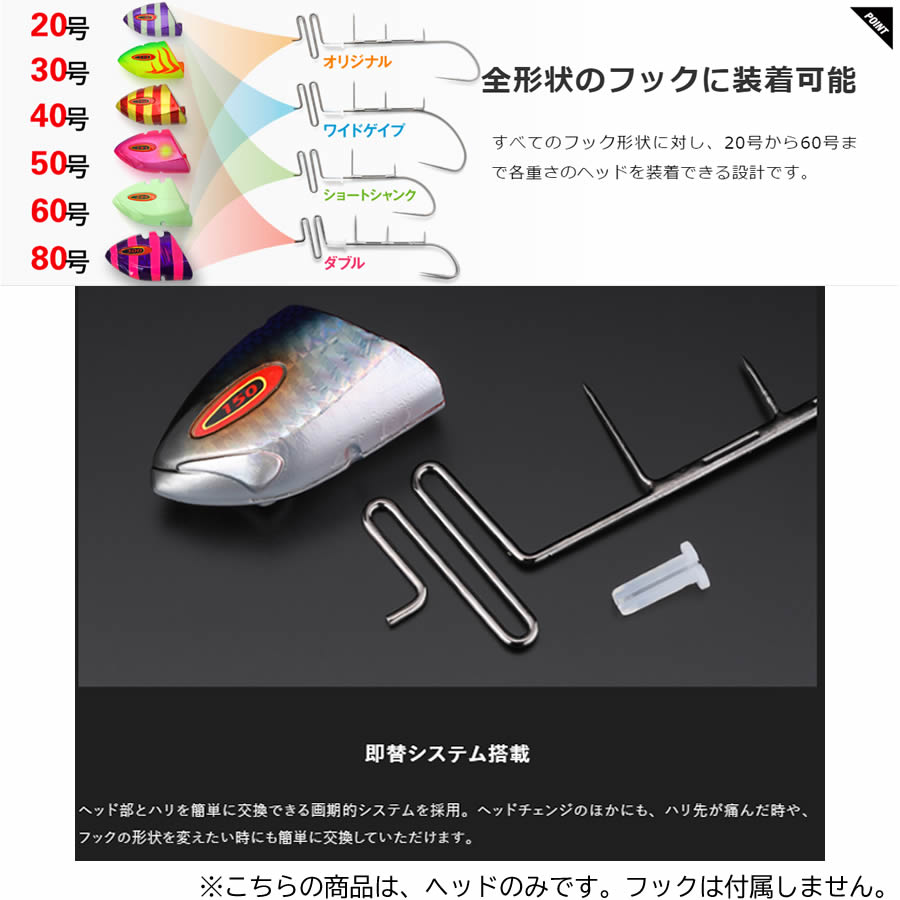 ジャッカル 替鈎式アンチョビドラゴンテンヤヘッド 50号 (オモリ)■Weight:50号(187g)≪ジャッカル オモリ≫●「即替システム」搭載で、ヘッドのカラーや重さ、または鉛ヘッドとTGヘッドを簡単に交換可能。●濁り具合や天気、魚の活性でヘッドのカラーを、水深や潮の速さでヘッドの重さを交換し、その日のベストセッティングをお探しください。●また、フックが痛んでもヘッド部分を再度使用可能です。※内容量・パッケージ等の仕様は、予告なく変更になります。悪しからずご了承下さい。●「在庫有り」の表示であっても、必ずしも在庫を保証するものではありません。掲載商品につきましては、各モール及び実店舗と在庫を共有しております。完売や欠品の場合は、誠にご迷惑をお掛けいたしますが、御注文をキャンセルさせていただく場合がございます。予めご了承ください。●商品画像は代表画像の場合もございます。商品名等をご確認の上ご購入ください。また、仕様変更により商品スペックやパッケージ、内容量などが変更となる場合がございます。仕様変更に伴う返品、商品交換の際の往復送料はお客様ご負担となります。予めご了承ください。変化する状況に合わせ、即替えシステムで一発交換
