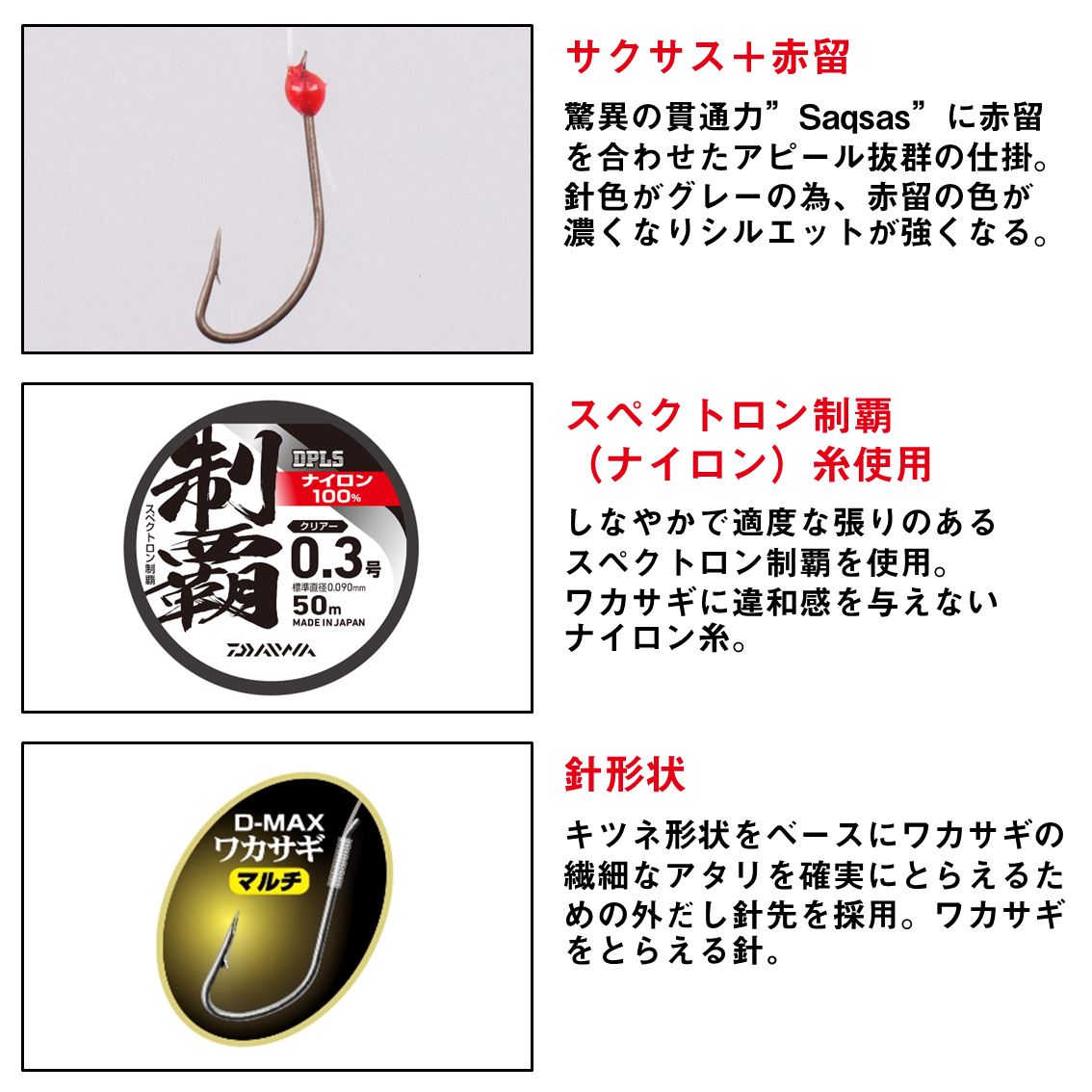 ダイワ クリスティアワカサギSS速攻ショート 赤留 M6本 (仕掛け 釣り)■全長(cm):72■幹糸(号):0.3■幹糸長さ(cm):10/12/11/10/8■タイプ:速攻ショート赤留■ハリス長さ(cm):2.0■フックタイプ:マルチキツネ型■入数:1■針数(本):6※内容量・パッケージ等の仕様は、予告なく変更になります。悪しからずご了承下さい。≪ダイワ 仕掛け 釣り≫●極細ショートハリスの「速攻」シリーズはハリの本数によってコンセプトを変えているこだわった設計にしています。●最も市場で支持されていると言っても過言ではない「赤留」にショートハリスが追加になります。●驚異の貫通力 サクサス針と組み合わせた今回の仕掛は、赤留がサクサスのグレーと相まって、シルエットが強い赤になるので濁りやローライトにも効果を発揮するような仕掛になっています。●「在庫有り」の表示であっても、必ずしも在庫を保証するものではありません。掲載商品につきましては、各モール及び実店舗と在庫を共有しております。(その為、展示品も含まれます。)完売や欠品の場合は、誠にご迷惑をお掛けいたしますが、御注文をキャンセルさせていただく場合がございます。予めご了承ください。●商品画像は代表画像の場合もございます。商品名等をご確認の上ご購入ください。また、仕様変更により商品スペックやパッケージ、内容量などが変更となる場合がございます。仕様変更に伴う返品、商品交換の際の往復送料はお客様ご負担となります。予めご了承ください。この商品のサイズは10、重さは25です。こちらのサイズが合計で100以下、且つ重さが700以下であれば、ゆうパケットで発送できます。この商品のみのご注文の場合、ゆうパケットでの配送時には合計で10個まで入ります。ショート&細ハリスで手返し重視の速攻ワカサギ仕掛け