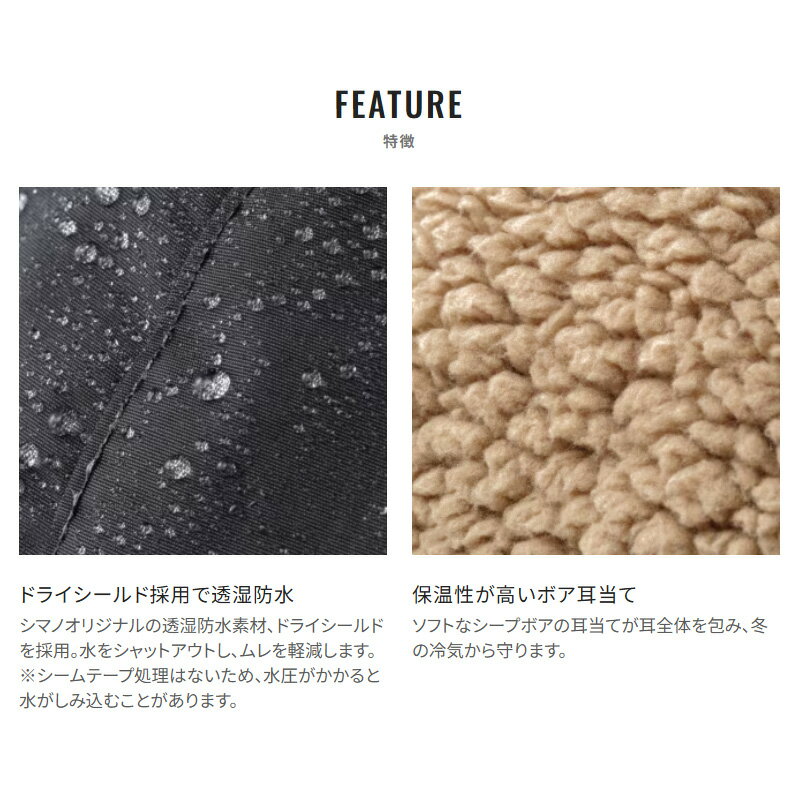 シマノ ボアキャップ ブラック CA-072Y (防寒キャップ 帽子 釣り)■素材:表:ナイロン100% (ポリウレタン透湿防風加工) 裏:ポリエステル100%≪シマノ 防寒キャップ 帽子 釣り≫●防水透湿性を備えた、耳当て付きボアキャップ●冷気から耳を守る保温性の高い耳当てが付いたボアキャップです。●防水透湿性を備えた生地を使用しており、雨や雪に強く、快適な被り心地を実現しました。●耳当て部分にはソフトなシープボアを採用し、高い保温性を確保しています。●顎部分には薄型ワンタッチバックルの調整ベルトを採用しており、フィット感を調整することができます。 ●「在庫有り」の表示であっても、必ずしも在庫を保証するものではありません。掲載商品につきましては、各モール及び実店舗と在庫を共有しております。(その為、展示品も含まれます。)完売や欠品の場合は、誠にご迷惑をお掛けいたしますが、御注文をキャンセルさせていただく場合がございます。予めご了承ください。●商品画像は代表画像の場合もございます。商品名等をご確認の上ご購入ください。また、仕様変更により商品スペックやパッケージ、内容量などが変更となる場合がございます。仕様変更に伴う返品、商品交換の際の往復送料はお客様ご負担となります。予めご了承ください。防水透湿性を備えた、耳当て付きボアキャップ