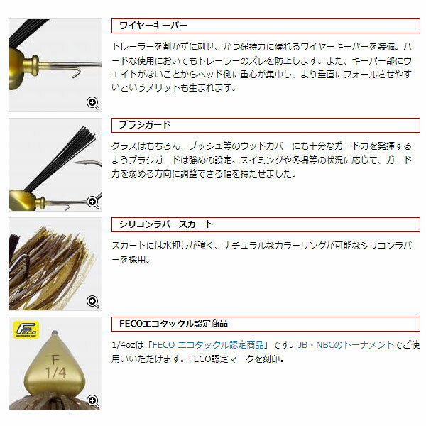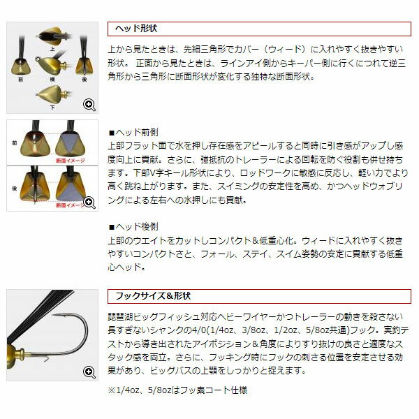 自重 3/8ozグラス対応のラバージグ。究極の形。 抜群の対グラス(ウィード)すり抜け性能を有する大西健太プロデュース・グラスリッパー。しかし、ただグラスに絡みにくいだけのジグではありません。あえて適度なスタック感を付加することで、手元に伝わる感度がアップするのと同時にすり抜けた後にストライクゾーンから大きく離れるのを防ぎます。さらに、高く跳ね上がり真下に落ちる理想的な跳ねアクションで、手前への移動を抑えてバスの目の前でしっかりアピールできます。そのうえ、低速から高速リトリーブまで対応の安定スイム姿勢、アピール力&ナチュラル感を高めるヘッドウォブリング・スイミングアクションまでも併せ持つ、跳ねてよし、巻いてよしのグラスジグの究極形です。また、その回避能力&操作性により、ウィードのみならずブッシュ、リーズ、ゴミ溜り等、あらゆるカバー撃ちに広域対応する性能も併せ持ちます。自重 ■3/8oz