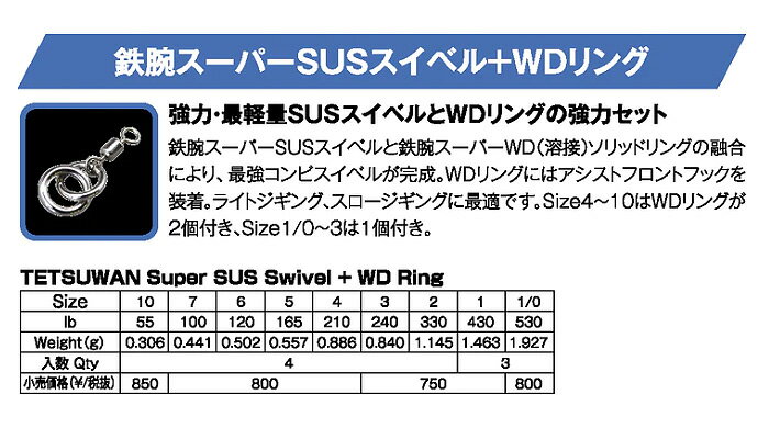 商品名 鉄腕スーパーSUSスイベル+WDリング 商品説明 ■強力・最軽量SUSスイベルとWDリングの強力セット 鉄腕スーパーSUSスイベルと鉄腕スーパーWDソリッドリングの融合により、最強コンビスイベルが完成。 WDリングにはアシストフロントフックを装着。ライトジギング、スロージギングに最適です。 #4~#10はWDリングが2個付き、#1/0~#3は1個付き。 商品詳細 ※サイズ毎の詳細はサイズを選択後、ページ下部に表示されます。 注意事項 - 検索キーワード 釣り フィッシング ルアー BBスイベル ボールベアリングスイベル 鉄腕スーパーSUSスイベルWDリング 鉄腕SUSスイベルWDリング 鉄腕スイベルWDリング #10 #7 #6 #5 #4 #3 #2 #1 #1/0 関連商品 鉄腕シリーズフィッシングサンイン Rakuten Shop は、 スーパーセール , お買い物マラソン 期間中も 年中無休 です( 土、日、祝日も営業 ) 。 13時 までのご注文は 即日発送 ( 近県は 翌日到着 の 最強配送 ) 。 ショップ 口コミ4.7 以上 。 楽天ランキング フィッシング 部門 上位 の ルアー 、 エギ の 新製品 を中心に 安価 にて販売しております。