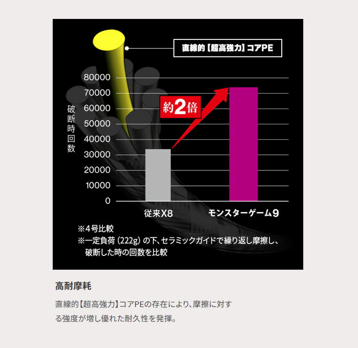 商品名 モンスターゲーム9 キャスティング 商品説明 ■次世代PEラインの革新 ■「モンスターゲーム9 キャスティング」は、特にキャスティングゲームにおいて抜群の耐久性と感度を発揮します。 従来のPEラインとは一線を画す独自技術を採用し、アングラーの期待に応える仕様となっています。 コア・インテグレーション・ブレイド製法 8本編のPEラインに超高強度PEの芯糸を組み込むことで、驚異的な耐摩耗性と感度を実現。ラインの安定性が向上し、キャスト時のコントロール性能が飛躍的にアップします。 ■超高強度 × 高耐久性 PEライン特有の柔らかさを持ちながら、芯糸による高い直線強度と耐摩耗性を兼備。激しいファイトでも安心して使用できます。 ■キャスト性能の向上 ラインのハリとコシを適切に調整し、ガイド抜けがスムーズに。飛距離が伸び、正確なキャスティングが可能になります。 ■高感度設計 従来のPEと比べて、魚からのわずかなアタリも手元に伝わりやすく、より繊細なゲーム展開が可能。 商品詳細 ■発売日:2025年3月 ※号数毎の詳細は巻糸量・号数を選択後、ページ下部に表示されます。 注意事項 - 検索キーワード 釣り フィッシング キャスティングゲーム キャスティング PEライン PE ライン 9本撚 9本編 9ブレイド デュエル モンスターゲーム9 キャスティング 200m 300m 0.6号 0.8号 1号 1.0号 1.2号 1.5号 2号 2.0号 3号 3.0号 4号 4.0号 5号 5.0号 6号 6.0号 8号 8.0号 10号 関連商品 モンスターゲーム9 シリーズフィッシングサンイン Rakuten Shop は、 スーパーセール , お買い物マラソン 期間中も 年中無休 です( 土、日、祝日も営業 ) 。 13時 までのご注文は 即日発送 ( 近県は 翌日到着 の 最強配送 ) 。 ショップ 口コミ4.7 以上 。 楽天ランキング フィッシング 部門 上位 の ルアー 、 エギ の 新製品 を中心に 安価 にて販売しております。