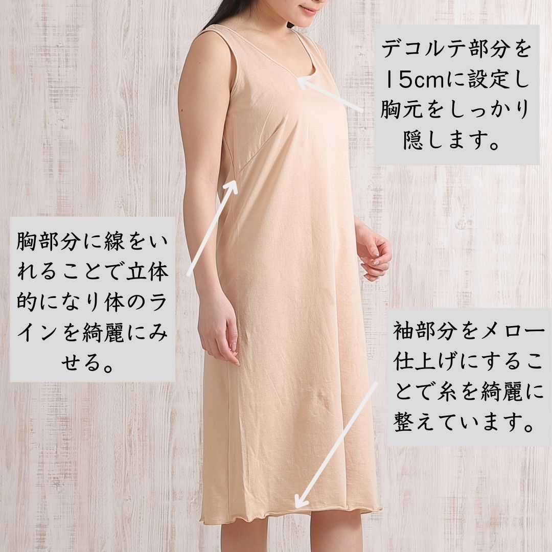綿100%で作られているので、肌に優しく、着心地がとっても良いんです! 通気性が抜群で、夏は涼しく、冬は暖かく過ごせます 吸水性が高いので、汗をかいてもすぐに水分を吸収して外に放出してくれるから、いつでも快適。 さらに、静電気が起きにくいのも嬉しいポイントです。 ブラ紐をしっかり隠してくれるデザインで、ワンピースの下に着るインナーとしてぴったり。 丈は90cm、100cm、110cmの3種類から選べるので、自分に合った長さを見つけられます。 日本製の安心感もあり、毎日のコーディネートに大活躍間違いなしです! ■モデル身長153cm 着用丈100cm綿100%で作られているので、肌に優しく、着心地がとっても良いんです! 通気性が抜群で、夏は涼しく、冬は暖かく過ごせます 吸水性が高いので、汗をかいてもすぐに水分を吸収して外に放出してくれるから、いつでも快適。 さらに、静電気が起きにくいのも嬉しいポイントです。 ブラ紐をしっかり隠してくれるデザインで、ワンピースの下に着るインナーとしてぴったり。 丈は90cm、100cm、110cmの3種類から選べるので、自分に合った長さを見つけられます。 日本製の安心感もあり、毎日のコーディネートに大活躍間違いなしです! ■モデル身長153cm 着用丈100cm サイズ バスト ヒップ ウエスト Mサイズ 79cm〜87cm 87cm〜95cm 64cm〜70cm L~LLサイズ 86cm〜94cm 92cm〜105cm 69cm〜85cm