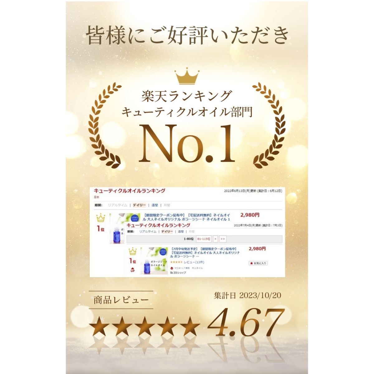 otonanail(大人ネイル)ボラージシード ネイルオイル は、素早く浸透するので、仕事中や、家事の合間など、隙間時間に塗ることができるので、こまめにネイルケアできます。保湿力が高いので、爪割れや、二枚爪、ジェルネイルで爪が傷んでしまった方に、特におすすめです。 ◇製品特徴 爪と爪周りを保湿し、栄養を与えます。 ◇成分 ホホバ種子油 グレープフルーツシード果皮油 ルリジザ種子油(ボラージシードオイル) ベルガモット果実油 アルガニアスピノサ核油 バオバブ種子油 テオブロマグランジフロルム種子脂 トコフェロール パルミチン酸アスコルビル レシチン ◇1日の使用目安:3〜6回 ◇内容量:【いずれか選択】・5ml ・10ml ・30ml ・5ml10mlセット ・10ml30mlセット ・サンプル15枚 ◇使用上の注意 ・体質体調により、まれに体に合わない場合(発疹など)があります。 その際はご使用を中止ください。 ・天然由来の原料使用のため色等が変化することがありますが、品質に問題ありません。 ◇保管および取り扱い上の注意 直射日光を避け、室温で保管ください。 ◇ご使用期限の目安について 開封後は1〜2ヶ月を目安になるべく早めにお使い下さい。 配合している天然成分により開封後は色・香りが変化することもありますが、 使用に問題ございません。 ◇廃棄方法 【10ml】 包装・資材 本体:ビン→リサイクル フタ:プラスチック→リサイクル 【5ml・30ml】 本体:プラ 内容物:油(成分表をご覧ください)→ 残った内容物は一般ごみへ ※「一般ごみ」とは「燃えるごみ」「家庭ごみ」等、各自治体により表現がことなりますので、お住まいの自治体へご相談ください。 トップページへ セット商品 ブランドで選ぶ ネイル用品 色から選ぶ ギフト ベースコート・トップコート 特集 リムーバー・速乾剤 ランキング ネイルケアアイテム 検定商品 ▼商品到着時のご注意▼ 検品を行ったうえ発送しておりますが、配送中に破損する場合がございます。 到着荷物開封の際は、お手回りの品等を汚さないようお気を付け下さい。 また、お買上げ商品以外の補償は出来かねますのでご了承ください。 ▼商品の色味について▼ 商品写真はブラウザによって見え方が変わる場合がございます。商品の色味はご参考までにお願いいたします。 メーカー希望小売価格はメーカーカタログに基づいて掲載しています※ボラージシードオイルが白く固まったら※ ボラージシードオイルは気温が低くなりますとオイルが白く固まる性質がございます。 室温で保管していただけると自然にサラサラのオイルになります。 品質に問題はございませんので、安心してお使いください。 ラインナップはこちら▽