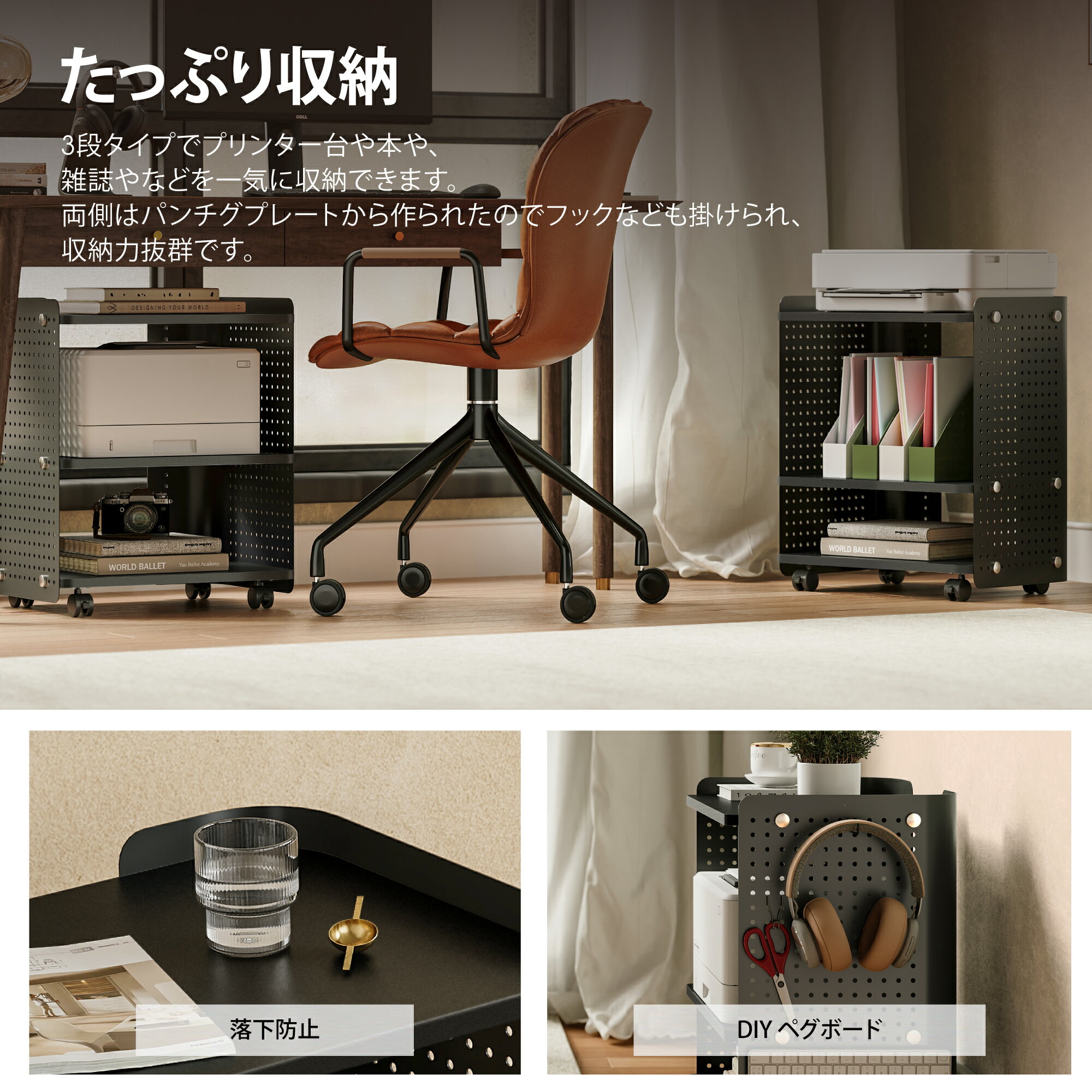 商品説明サイズ45*33.5*55cmカラー白/黒/ブラウン/オーク商 品重 量約9.5kg耐荷重50KG商 品紹 介🌸【たっぷり収納のペグボード付きプリンター台】プリンター台は3段タイプで上段はプリンターや電話、中段はノートブック本種類、下段はA4ファイルやデスクトップなど収納できます。プリンター ラックの両側はペグボード付きで色々な小物を収納できます。🌸【用途に合わせて可動棚のプリンターラック】サイドワゴンの中段棚の位置は2cm間隔で用途に合わせて無段階調整でき、サイドワゴンの使い方をカスタマイズできます 。🌸【移動らくらくキャスター付きのデスクワゴン】プリンター 台はバックパネル付きでプリンターの動作中のラック横揺れやグラつきを防ぎます。キャスタがストッパーが付きで移動や固定も簡単です。 🌸【様々な場所に使えるプリンター 台】デスクワゴンの高さは55cmでデスク下の収納にぴったりです。オフィスのプリンター台や電話台はもちろん、ご自宅の収納棚としてもお使いいただけます。