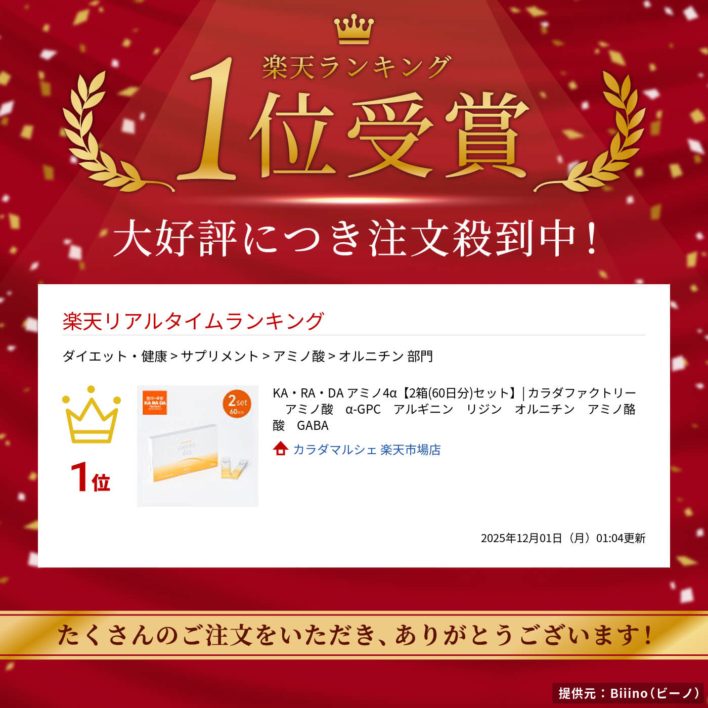 商品概要「明日のKA·RA·DAを創る」をミッションとするカラダファクトリーからの新提案。カラダを考えた「4つのアミノ酸」と話題の成分「α-GPC」を配合したコンディショニング・アミノ酸アサプリメント。朝からスッキリしたい、元気がほしい、イキイキしたい…。毎日のコンディションを整えたいすべての方へオススメします! 【KA·RA·DA アミノ4αの特長】 ●明日のカラダを考えた 「4つのアミノ酸」 *γ-アミノ酪酸(GABA98%) 40mg *L-アルギニン 200mg *L-リジン 200mg *オルニチン 200mg ●アミノ酸をバックアップ! 母乳にも含まれる「α-GPC」も260mg配合! 【1回分ごとに個包装。携帯に便利、いつでもフレッシュ!】 ●くちどけのよいパウダータイプのサプリメント。 ●水なしでもお召し上がりいただけます。 ●ほのかなグレープフルーツフレーバー。 クセがなくてもおいしくお召し上がりいただけます。名称アミノ酸含有加工食品内容量90g(3g×30本)原材料名還元麦芽糖水飴(国内製造)、難消化性デキストリン、α-GPC加工食品(グリセロホスホコリン、加工油脂)、マカエキス末(マカエキス、マルトデキストリン)、オルニチン、γ-アミノ酪酸/L-アルギニン、L-リジン塩酸塩、クエン酸、ビタミンC、香料、微粒子二酸化ケイ素、ナイアシン、甘味料(アスパルテーム・L-フェニルアラニン化合物)、ビタミンB2、ビタミンB6、ビタミンB1保存方法直射日光・高温多湿を避けて保存し て ください。栄養成分表示《1本(3g)あたり》エネルギー:11.73kcal たんぱく質:0.95g 脂質:0.05g 炭水化物:1.88g 食塩相当量:0gお召し上がり方1日1本を目安にそのまま、あるいは水、ぬるま湯などと一緒にお召し上がりください。ご使用上の注意1.個包装開封後は速やかにお召し上がりください。 2.乳幼児の手の届かない所に置いてください。 3.体調・体質により、まれに合わない場合がありますので、医師にご相談の上ご利用ください。 4.疾病治療中の方、及び妊娠・授乳中の方は、医師にご相談の上ご利用ください。 5.水濡れや汚れのつかない衛生的な環境でお取り扱いください。 6.食物アレルギーのある方は、原材料名をご確認の上ご使用をお決めください。 食生活は、主食、主菜、副菜を基本に、食事のバランスを。