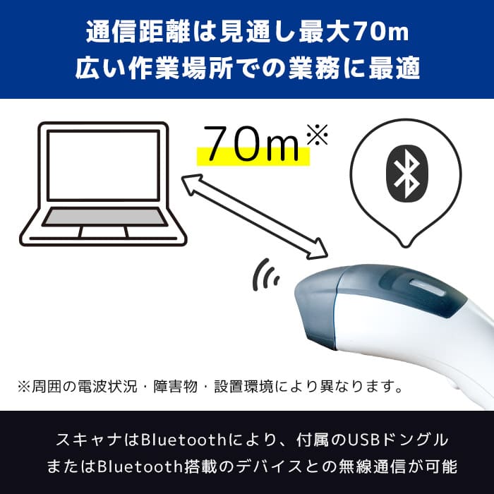 詳細仕様 製品型番 KC-5200BT(W) KC-5200BT(B) カラー ホワイト ブラック JANコード 4580298765424 4580298765431 インターフェース スキャナー本体:Bluetooth5.0 HID / SPPスレーブモード USBドングル:USB-HID / USB-COM 無線通信距離 見通し 約70m ※周囲の電波状況・障害物・設置環境により異なります。 インジケーター ビープ音, LED, バイブレーション イメージセンサー解像度 CCD 2500 pixels 最小分解能 4 mil スキャン速度 最大270スキャン/秒 光源 赤色LED PCS値 30%以上 読取深度 30-50mm (Code39_4mil) / 20-180mm (EAN-13_13mil) 対応コード 【1次元コード】 All UPC/EAN/JAN, Code 39, Code 39 full ASCII, Code32, Code128,NW-7/CODABAR, Interleaved 2 of 5, Industrial 2 of 5, MSI, Matrix 2 of 5, Code 93, Code11, Telepen, GS1 Databar, GS1 Databar Expanded, GS1 Databar Limited バッテリータイプ リチウムポリマー 3.7V 1050mAh 動作時間 6時間(フル充電時、1秒に1回スキャン) ※バッテリーの劣化状況に依存します 充電時間 約4時間 消費電力 スタンバイ時:168mA, 動作時:210mA 使用温度 動作温度:0℃ 〜 40℃ / 保管温度:-20℃ 〜 60℃ 使用湿度 10% 〜 90%(結露しないこと) 衝撃耐性 1.5mからコンクリートに自然落下し正常動作 外形寸法 185.48mm (L) x 66.57mm (W) x 90.83mm (H) ※図面参照 重量 146g(バッテリーを含む) 筐体素材 ABSプラスチック 同梱品 USBドングル、充電用USB Type-C ケーブル(※1)、USB電源アダプター(5V/1A)、クイックスタートガイド オプション 専用ハンズフリースタンド(HOL-KCII)、USB充電アダプター(追加用 PS06CA050K1000JU-BK / 出力:DC5V 1.0A) 1. USB充電ケーブルを通信で使用することは、内蔵バッテリーの消耗を引き起こすため推奨しておりません。 急速充電器のご使用は、本製品に故障等の影響を与える可能性があるためお控え下さい。それによる不具合に関しては、保証の対象外となります。 【関連キーワード】 ワイヤレス バーコードリーダー バーコード 無線 一次元コード ミドルレンジ スキャナー KC-5200BT USB Bluetooth GS1 FKsystem エフケイシステムセットで税込2640円OFF!全部揃っておトク!スマレジ・Airレジ・square対応POSレジセット KC-5200BTエフケイシステム ワイヤレス バーコードリーダー | Fksystem 付属のUSBドングルでBluetooth通信が可能! 大きめコードもスキャン可能なミドルレンジ対応のワイヤレススキャナー。Bluetooth接続できるUSB通信ドングルが付属しており、Bluetooth非搭載デバイスでも無線接続が可能になります 見通し最大70mの通信距離 毎秒1スキャンで6時間駆動が可能 1.5m の落下に耐える優れた衝撃性能 270スキャン/秒の高速スキャニング バイブレーション機能搭載 医療規格バーコードGS1 Databar対応 メモリーモードで通信範囲外でも作業可能 KC-5200BTはUSBドングル経由でデータを送信する、ワイヤレスバーコードリーダーです。専用のUSBレシーバーを通じてBluetoothの無線通信を行います。Bluetoothが搭載されていないデバイスでも、USBポートがあればワイヤレスで通信が可能です。ケーブルが無いから、ストレスフリーで快適です。 通信範囲は見通し70mと広範囲で、広い作業場でも快適に作業ができます。メモリーモードに設定すれば取り込んだデータを本体に蓄積できるので、範囲外でも作業が可能です。 ボディは人間工学に基づいた握りやすいデザイン。バッテリー込みでも146gと、女性でも持ちやすい軽量スリム設計。さらに1.5mの落下耐性がついており、安心して作業ができます。 フル充電で毎秒1スキャンの6時間駆動可能なバッテリーを搭載。バイブレーション機能も搭載されており、音の出せない環境でも安心して作業ができます。 当製品は「KC-5200ZB」の後継機となります。前モデルとの相違点については【⇒ こちら(PDF)】をご確認ください。 SPEC スペック 製品型番ホワイト:KC-5200BT(W)ブラック:KC-5200BT(B) インターフェイススキャナー本体:Bluetooth5.0 HID / SPPスレーブモード USBドングル:USB-HID / USB-COM サイズ185.48mm (L) x 66.57mm (W) x 90.83mm (H) ※図面参照 電源供給内蔵バッテリー 重量146g(バッテリーを含む) 落下耐性1.5mからコンクリートに自然落下し正常動作 通信距離見通し 約70m※周囲の電波状況・障害物・設置環境により異なる 動作時間6時間(フル充電時、1秒に1回スキャン)※バッテリー劣化状況に依存します。 同梱品USBドングル、充電用USB Type-C ケーブル(※1)、USB電源アダプター(5V/1A)、クイックスタートガイド メーカーエフケイシステム FKsystem メーカー保証1年間 1. USB充電ケーブルを通信で使用することは、内蔵バッテリーの消耗を引き起こすため推奨しておりません。 掲載値はメーカー規定の測定方法によるものです。保証値は別途仕様書をご参照ください。 記載内容は予告無く変更されることがあります。あらかじめご了承ください。 見通し70mの通信距離 無線通信は見通しで最大70m(※)まで可能。スキャナーはBluetooth接続対応で、付属のUSBドングルまたはBluetooth搭載のデバイスと無線で通信します。 ※周囲の電波状況・障害物・設置環境により異なります。 人間工学に基づいたフォルムデザイン スリムなボディは手の小さな女性でも持ちやすく、