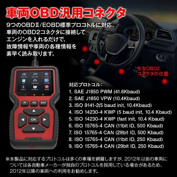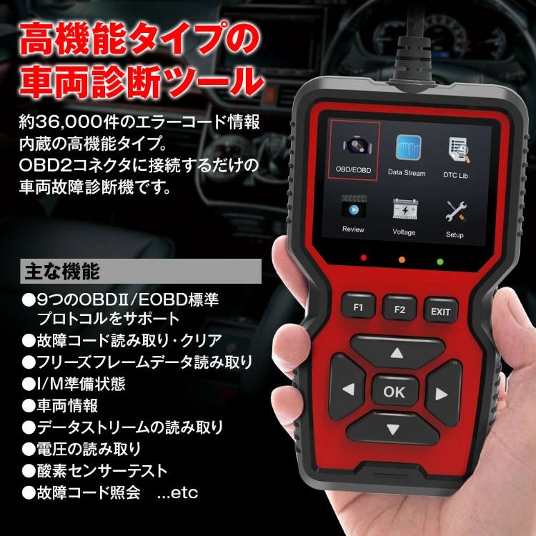 約36000件のエラーコード情報内蔵!高機能タイプのOBD2車両診断機 9つのOBD2/EOBD標準プロコトルに対応の機能車両故障診断装置です。車両のOBD2コネクタに接続してエンジンを入れるだけで、故障情報や車両の各種情報を素早く読み取る事ができます。 OBD故障診断機の主な機能 9つのOBD/EOBD標準プロトコルをサポート、故障コード読み取り・クリア、フリーズフレームデータ読み取り、I/M準備状態、車両情報、データストリームの読み取り、電圧の読み取り、酸素センサーテスト、故障コード照会...etc ※自動車メーカーや車種、年式等により表示非対応の項目がある場合があります。 車両OBD汎用コネクタ 9つのOBD/EOBD標準プロトコルに対応。車両のOBD2コネクタに接続してエンジンを入れるだけで、故障情報や車両の各種情報を素早く読み取ります。 エンジン故障診断 車両故障コードを迅速に読み取ります。故障コードをクリアする機能も搭載。 約36000件の故障コード情報内蔵 コード照会機能で故障コードの内容を検索できます。従来品は約3000件の情報内蔵ですが、本製品はなんと約36000件内蔵!あらゆる故障コードについて検索できます。 I/M準備状態 排ガス関連の諸項目をテストする機能です。エンジン系の一連の項目をスキャンし、迅速に結果を出します。 リアルタイムのデータ読み取り エンジンのリアルタイムのデータを迅速に読み取ります。車両の走行状態、潜在問題などをより簡単に発見できます。 対応プロトコル SAE J1850 PWM (41.6Kbaud) SAE J1850 VPW (10.4Kbaud) ISO 9141-2(5 baud init, 10.4Kbaud) ISO 14230-4 KWP (5 baud init, 10.4 Kbaud) ISO 14230-4 KWP (fast init, 10.4 Kbaud) ISO 15765-4 CAN (11bit ID, 500 Kbaud) ISO 15765-4 CAN (29bit ID, 500 Kbaud) ISO 15765-4 CAN (11bit ID, 250 Kbaud) ISO 15765-4 CAN (29bit ID, 250 Kbaud) 動作電圧:DC9〜16V 動作電流:48〜72mA 動作環境:-20〜65℃ 保存温度:-30〜70℃ 本体サイズ:約155×87×24mm 表示言語:日本語含む10言語対応 内蔵エラーコード情報:約36000件 商品内容 本体×1 ご購入前のご注意 ※新エネルギー車、ハイブリット車、OBD2協定非適合車、自動車メーカー独自のOBD規格採用の車種については対応しない場合があります。 ※2002年以前J-OBD規準の国産車には対応できません。 ※本製品に対応するプロトコルは多くの車種を網羅しますが、2012年以前の車両については各自動車メーカーが独自のプロトコルを採用している場合があるため、2012年以降の車両への利用をお勧めします。 ※本製品には修理部品が含まれていないため、分解や改造を行わないでください。 「商品ページ」に保証期間が記載されている場合は商品ページの保証期間が適用されます。ご購入前に必ずご確認頂きます様お願い致します。 その他の商品保証に関しましては「返品、交換、保証について」を、ご注文前に必ずご確認下さい。 ご注文後の、保証内容錯誤による、ご対応は一切お受けできません。