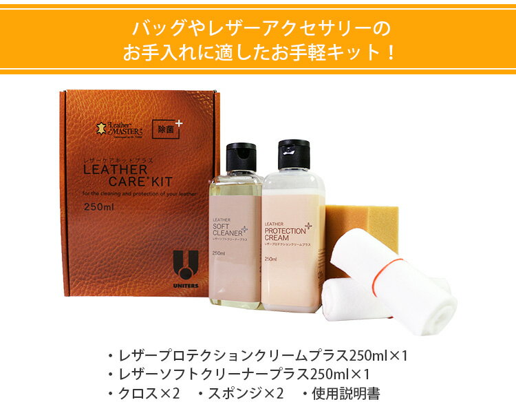 ■商品名:レザーケアキット プラス LMplus250 ■品番:UFE-0042 ■サイズ:レザーマスターの一番大きなサイズで、リビングセットなど革製品を沢山お持ちの方に適したサイズ ■セット内容・レザープロテクションクリームプラス(250ml)×1・レザーソフトクリーナープラス(250ml)×1・クロス×2・スポンジ×2・使用説明書 ■ご注意: 【2022/04/19:除菌効果をプラス】※本品は、水で薄めずそのままで使用してください。※スエードやヌバック、ベロアなどの起毛素材には使用できません。※白い革へご使用いただく際のご注意 長くご使用されているお品へご使用いただく際、表面のウレタン加工がはがれておりますと、変色等してしまう可能性がございますので、ご注意くださいますようお願い致します。 ※商品の色はモニターの具合で実物と若干異なる場合がございます。予めご了承下さい。 ※デザイン、仕様等につきましては、予告なく変更する場合がございます。予めご了承下さい。※ご予約・お取り寄せ商品は、ご注文受付後にお客様ご注文分としてメーカーへ発注を致します為、基本的にキャンセルやご返品はお受けできません。 ※複数店舗を運営しておりますため、ご注文の入れ違い等で欠品などになってしまう場合がございます。万が一、発送が遅れる場合は、ご注文受付当日中にご案内差し上げます。誠に恐れ入りますがご了承くださいますよう、お願い申し上げます。レザーケアキット プラス LMplus250 取り扱い数楽天一!安心のレザーマスター正規日本代理販売店 商品レビュー総合評価 ★4.76レビュー件数:51件 2024/09/05(木) 時点 商品を購入された方のレビュー評価 5.00 / 購入者さん 50代/女性 リピ確実です皮のお手入れを始める前はかなり心配でしたが、とても扱いやすく仕上がりも大満足です。仕上げの保護クリームの後は皮の手触りが明らかに違いました。継続して使用したいと思ってます 実用品・普段使い 自分用 投稿日:2021年10月26日 他のレビューを見る 革製品のクリーニング、保護用に開発されたお手軽なキット レザーのお手入れに必要な下記4つのアイテムをセットしています。ソファやリビングセット・パーソナルチェアなど比較的広い革製品のお手入れ適したサイズです。●革製品のクリーニングに必要なクリーナー●汚れ防止効果を高める保革剤のクリーム●クリーニングに必要なクリーニングスポンジ●保革剤の塗布に最適なタッチアップクロスレザーマスター レザーケアキットプラスは、従来のレザーケアキットに除菌効果がプラス!クリーニング効果と除菌効果で汚れと菌をまとめて除去できます。アルコール、軽油などの溶剤フリーのため、革を傷つけることなくデリケートな革にもご使用いただけます。さらに生活臭・タバコ・アンモニア臭なども中和消臭。環境にも人にも優しく、革本来の特徴を変えず簡単に色々な革製品がお手入れできます。 詳細 レザーケアキットには、ユニタス社が世界で初めて開発した水性のアニリン仕上げやヌメ革※にも対応できるレザーソフトクリーナー、レザープロテクションクリームがセットされています。 すべてのレザーメンテナンス剤は水性で革本来の特徴を変えることなく革製品のお手入れができる大変便利なキットです。※ヌメ革にレザープロテクションクリームを使用すると革が濡れて濃くなりますが、乾燥してくると元の状態に戻ってきます。ただし革の種類によっては多少変化が出る場合があります。 今まで一度もレザープロテクションクリームでお手入れされていないヌメ革にレザーソフトクリーナーを使用すると、乾燥後も色が濃くなり元の状態には戻せません。◆ レザーソフトクリーナー革製品についた水溶性のシミや日常の使用で発生した汚れを、泡で浮かせて除去します。 革の色、艶、風合いを損なわずに繊維の奥深く浸透し、表面に付着した汚れは勿論、カビの発生の原因になりやすい毛穴の内部に付着した汚れを簡単に取り除くことができます。 アルコールや軽油などの溶剤が含まれていない水性クリーナーのため、革にやさしく、表面加工にダメージを与えることなく洗浄効果を発揮します。また、嫌な生活臭やタバコの臭いを消臭する効果もあります。※爬虫類製品には使用できません。◆ レザープロテクションクリーム汚れやシミが皮革製品の奥に染み込んでしまうと、それらの汚れを落とすことが本質的に難しくなるのですが、このクリームは汚れやしみが皮革製品の奥に染み込むのを防いでくれます。 革に必要な栄養を与え、革の内側に「バリア」のように通気性の高い保護膜を形成し、蓄積する汚れの浸透を防ぎます。保護膜は撥水、撥油効果があり、汗や皮脂などの侵入を防ぎます。 また、汚れを付着しにくくさせ、付着しても取りやすくなり、革が痛むのを抑えます。環境にも人にもやさしい水性の保革剤のため、安心してご使用いただけます。 プロテクションクリームを新しい皮革製品にご使用いただくことにより予