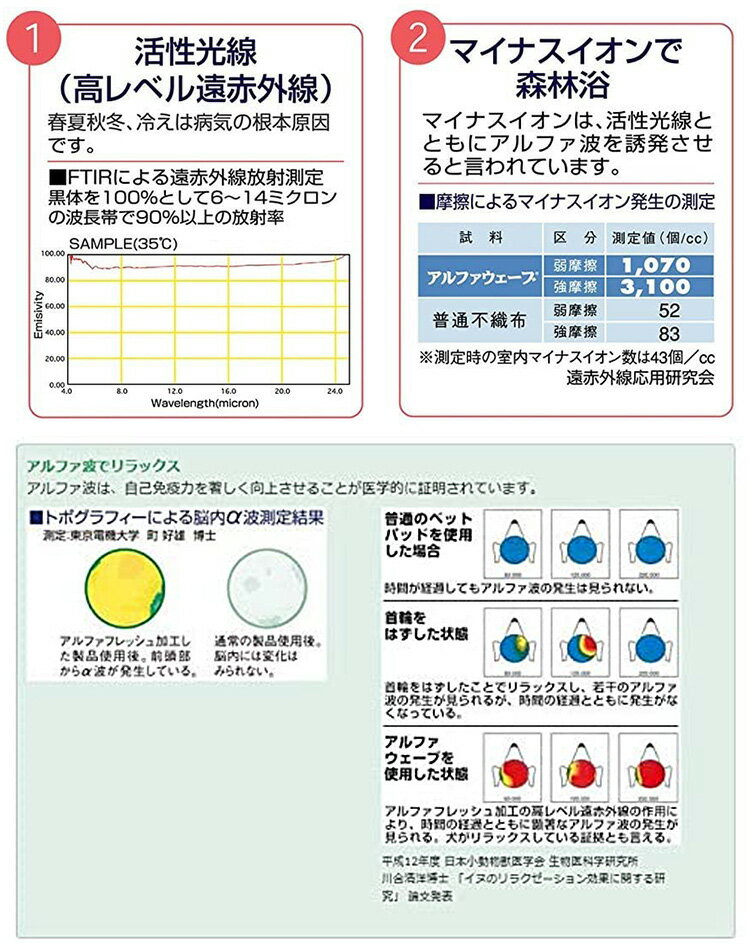 ■商品名:アルファウェーブ PET Lサイズ(60×80cm) ■品番:ASYB-alphawave-L ■カラー・デザイン:表/ベージュ、裏/イエロー ■サイズ(約):60cm×80cm ■材質:中綿、遠赤外線加工不織布:ポリエステル100% ■目安犬種:中型〜大型犬■丸洗い可能、折りたたみ可能 ■生産国:日本 ■ご注意: ※商品の色はモニターの具合で実物と若干異なる場合がございます。予めご了承下さい。 ※デザイン、仕様等につきましては、予告なく変更する場合がございます。予めご了承下さい。※ご予約・お取り寄せ商品は、ご注文受付後にお客様ご注文分としてメーカーへ発注を致します為、基本的にキャンセルやご返品はお受けできません。 ※ご注文後にメーカーへ在庫確認をさせていただきますため、万が一、メーカー都合により商品がご用意できない場合は、改めてご連絡差し上げます。 誠に恐れ入りますがご了承くださいますよう、お願い申し上げます。 ※ メーカー直送商品について ※ こちらはメーカーから直接商品を発送いたします。 また、北海道・沖縄・その他離島は発送不可となります。 ※配送業者は変更となる場合がございます。 ※納期はご注文後(決済完了後)、都度確認いたします。 ※代引き払い、ラッピング、他商品との同梱はできません。 ※ご注文確定後のキャンセルは一切できませんので、予めご了承ください。 カラーカテゴリー:イエロー/Yellow/黄色/ベージュ/Beige/アルファウェーブ PET Lサイズ(60×80cm) 体の芯から温めるペット用遠赤外線マット。 製品の特徴 人間同様、ペット達も「体の中を温めて代謝を良くし、免疫力を上げる」ことは、健康&元気の鉄則です。ただ寝ているだけで体の芯から温まるのが実感できる商品です。その理由は、生物にとって最も有益な波長(10μ)の遠赤外線が、体に吸収されて熱に変わるからです。特に関節や疾患のあるペットやエアコンの使用時や床に寝ているペットには、夏でも冷えは病状の悪化にもつながることがあります床ずれ防止マットホームナースの上に重ねてご使用いただくと保温と通気性を兼ねそろえた最高のシニアペット用介護マットになります。●こんな子におすすめ介護が必要な子、関節痛や疾患がある子、寒がり、暑がりな子● 活性光線(高レベル遠赤外線)「冷えは万病の元」活性光線は血行をよくし、体の芯から温めます。● マイナスイオンでリフレッシュ活性光線と共にアルファ波を誘発するので「使いながら森林浴」● アルファ波でリラックス自己免疫力を向上させることが医学的に証明されています。● 消臭効果で嫌な匂いを取る分子の活性化による、臭い分子の包み込み消臭作用です。● 耐洗濯性繊維製品で100回以上のテストに合格していますので年10回洗うとしても10年はもちますしシーツを被せて使用されれば、本体は日干し・陰干しだけでよく、本体は形状がある限り遠赤外線効果は持続します。● ホルマリン日本紡績検査協会(JSIF)のホルマリン(ホルムアルデヒド)量測定で0.01ppm以下です。これは、厚生省令第34号アセチルアセトン法(乳幼児用)に合格しています。 アルファウェーブとは セラミックなどとは違い、天然有機物(活性たんぱく質)から抽出した液体を使って活性光線を出す画期的な製品です。液体ですので素材の隅々まで行きわたり、素材自体が「遠赤外線発生体」に変わります。そして プリントコーティング加工を施していますので 洗濯しても落ちることはなく効果は変わりません。(耐洗濯性報告書) 関連商品はこちら Sサイズ(45×35cm)アルファウェーブ PET Mサイズ(45×60cm)アルファウェーブ PET Lサイズ(60×80cm)アルファウェーブ PET LLサイズ(75×100cm)アルファウェーブ PET ■keyword:ペット/マット/ペットマット/遠赤外線/遠赤/遠赤外線マット/アルファ/ウェーブ/犬/猫/子犬/子猫/イヌ/いぬ/ネコ/ねこ/dog/cat/成犬/小型犬/中型犬/大型犬/老犬/介護犬/介護/代謝/免疫力/活性化/血行/血行促進/健康/リラックス/癒し/洗濯可/丸洗い/お手入れ/簡単/ぽかぽか/あったか/芯から暖かい/消臭/防臭/ケア/冷え/冷え対策/温活/ソフトタッチ/やわらか/さらさら/快適/通年/1年中/冬/POPO先生/alpha/wave/屋内/室内/日本製/日本/