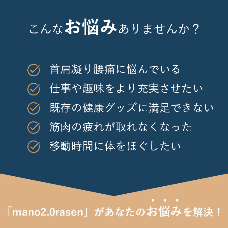 ■商品名:コンパクト整体ツール mano2.0rasen(マーノ ラセン) ■自社品番:ネイビー(HOLI-rasen-NV)パープル(HOLI-rasen-PU) ■サイズ(約):高さ66×奥行66×横幅135mm ■素材・成分:シリコーンゴム ■重量(約):340g ■生産国:日本 ■備考:●本製品は指圧代用器です。医療器具ではございません。●万が一使用中に体調が悪くなった場合は医師にご相談ください。●お子さまだけでの使用はお避け下さい。事故や怪我のおそれがあります。●まれに使用直後、もしくは翌日以降に揉み返しや筋肉痛のような症状が出る場合があります。症状が強く気になる場合は冷却などの処置を専門家の指示のもと行ってください。●次のような場合は医師に相談をお願いします。・妊娠中またその可能性のある方 ・使用する部位に外科的疾患、既往歴がある場合 ・お身体の状態に不安がある方 ・強い痛みのある方 ・骨密度が低下している方 ・内出血しやすい方 ・情緒不安定または精神的不調を強く感じる方●次のような場合は使用をお避け下さい。・飲酒、発熱時 ・外傷直後・めまいを感じる時 ・不安感が強い時 ・吐き気がする時●次のような場所での利用・保管はお避け下さい。・高温多湿な場所 ・廊下や人が歩く場所での使用および放置●胸部および背面上部には肋骨があるため、痛みや違和感がある際は強い圧は避け、すぐに本体を取り除ける状態でご利用ください。また、気胸や肋間神経痛など、胸部及び肋骨に不安がある方は使用をお避け下さい。 ■ご注意: ※商品の色はモニターの具合で実物と若干異なる場合がございます。予めご了承下さい。 ※デザイン、仕様等につきましては、予告なく変更する場合がございます。予めご了承下さい。 ※ご予約・お取り寄せ商品は、ご注文受付後にお客様ご注文分としてメーカーへ発注を致します為、基本的にキャンセルやご返品はお受けできません。 ※複数店舗を運営しておりますため、ご注文の入れ違い等で欠品などになってしまう場合がございます。万が一、発送が遅れる場合は、ご注文受付当日中にご案内差し上げます。誠に恐れ入りますがご了承くださいますよう、お願い申し上げます。 ■広告文責:エルスタイル(株) 092-725-1137コンパクト整体ツール mano2.0rasen(マーノ ラセン) 整体のプロが開発した、上質な手技を再現するセルフケアツール。凝りや疲れに深く届き、あなたの体を芯から解き放ちます。 整体のプロが追求した独自設計 「もっと気軽に、もっと本格的に体をケアしたい」そんな思いから生まれたのが、鍼灸あん摩マッサージ指圧師・カイロプラクターの石垣英俊氏が自身の施術を再現したセルフケアツール「mano2.0 rasen」です。長年の経験と確かなノウハウから導き出された独自のフォルムは、まるでプロの手でほぐされているような上質な使い心地を実現します。 あなたの悩みを解決する3つの理由 1. 熟練したプロの施術を再現したデザイン「ほぐしのプロ」として多くの体を診てきた石垣英俊氏の経験と視点が、このツールのデザインに凝縮されています。ただの球形や筒状とは違う、独特な曲面や突起の配置は、プロの「さじ加減」を誰でも再現できるように設計されました。2. 体の要所を効果的にほぐせる「mano2.0 rasen」は、全身のセルフケアに対応していますが、特に体の軸となる“背骨”や、“足”、“骨盤”、“胸郭・肩甲骨まわり”といった要所を効果的にほぐせます。これらの部位は骨と関節が密集し、複雑な凹凸やカーブがあります。「rasen」は、手技の工夫をそのままデザインに落とし込むことで、無理なくピンポイントでアプローチできます。3. 一人ひとりの体に寄り添う「わたし仕様」のケア日常のちょっとしたリフレッシュから、プロアスリートの本格的なメンテナンスまで、使い方はあなた次第。「mano2.0 rasen」は、使い方を変えることで、一人ひとりの体の状態に合わせたセルフケアが可能です。 6つの独自機能 「rasen」は一見、連結したボールやフォームローラーに見えますが、プロの知恵とこだわりが詰まった機能的なフォルムが特長です。1. 寄せては返す左右の突起転がすと、左右の突起が近づいたり離れたりする独自設計。足の裏で転がすと、まるで手で包み込まれるような心地よさを再現します。直線的な動きだけではない、プロのなめらかな手技を実現しました。2. 傾斜と曲面で極まる指圧感同じ部位に当てても、当て方によって圧の方向や強さを変えられるため、細かな「さじ加減」が可能に。単一的な刺激になりがちなボールやフォームローラーとは違い、体の状態や好みに合わせて使い分けられます。3. 骨格形状にフィットする溝突起の間にある溝は、背骨の棘突起(きょくとっき)にフィットするように設計されています。骨への負担を避けながら筋肉をほぐすことが可能です。また、骨盤や股関節周りにもスムーズにアプローチできます。4. 手にフィットするフォルム女性や手の小さい方でも片手でしっかり握れます。押したり、こねたり、