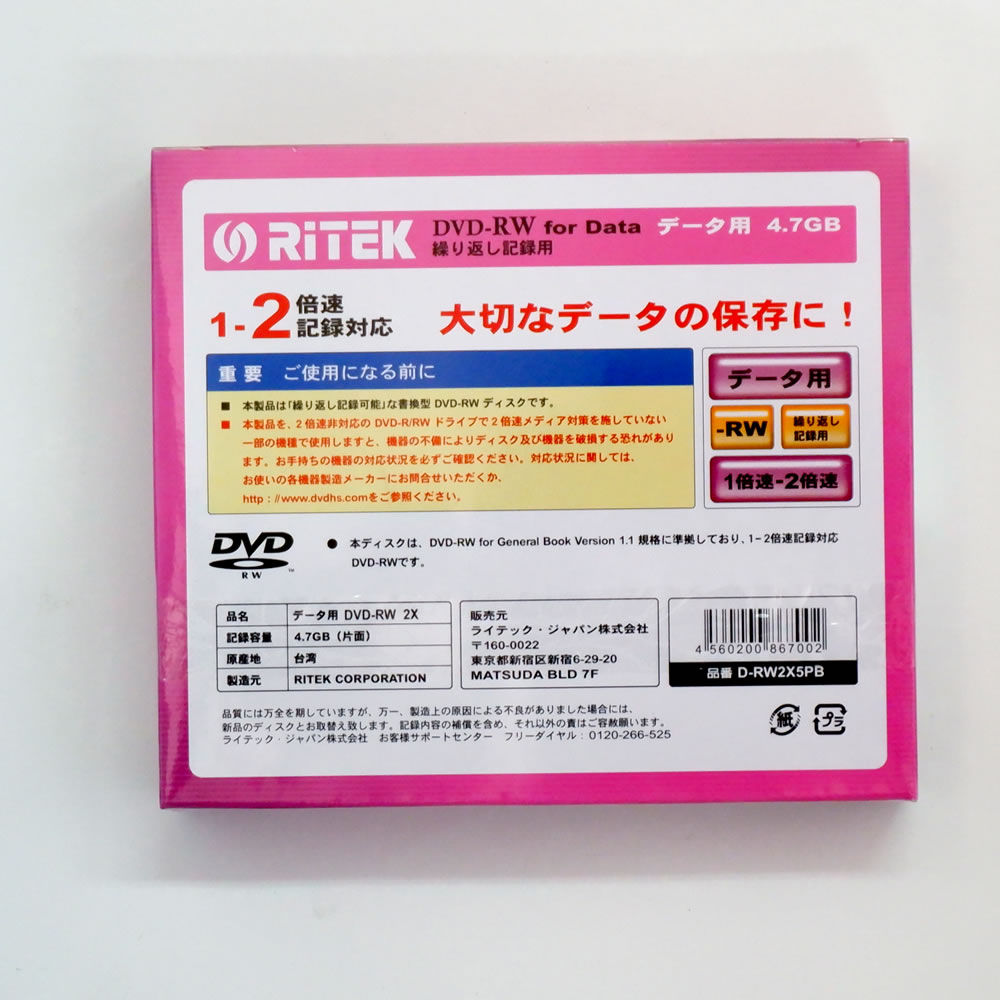 【最終処分特価】 処分品のため、初期不良を含めサポート対象外となります。 商品にはキズ・汚れなどある場合がございます。 シュリンク(包装)破れや外箱破損がある場合がございます。 ケース破損のある場合がございます。 返品はご容赦ください。 売切れの際はご容赦ください。 製品仕様 製品型番 D-RW2X5PB JANコード 4560200867002 規格 DVD-RW 用途 データ用 容量 4.7GB 対応速度 1-2倍速対応 レーベル メーカーレーベル 印刷範囲 印刷不可 枚数 5枚 ケース 5mmスリムケース ブランド RITEK