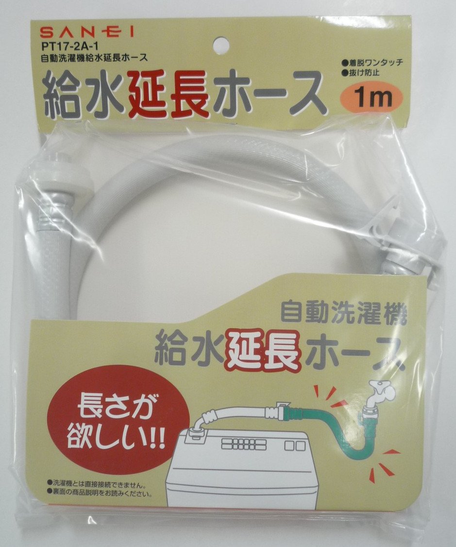 用途全自動洗濯機用ホースの延長用。既存の洗濯機用給水ホースでは長さが足りない場合、給水ホースを延長する際に使用します。 ほとんどのメーカーに適合各メーカーの元口、洗濯ニップルに適合します。また、各メーカーの自動洗濯機給水ホースに合います。日本電機工業会規格(JEM1206)品を対象。 サイズ長さ:1m、ホース内径:12.5mm、ホース外径:18.5mm 特長着脱がワンタッチで可能。抜け防止のロックレバー付き。抗菌ホース。 取付方給水ホースのつまみとロックレバーを引き下げながら延長ホースに差し込みます。接続後、ホースを引っ張って抜けない事を確認してからご使用ください。延長ホースの反対側もつまみとロックレバーを引き下げながら洗濯水栓または洗濯ニップルに差し込みます。接続後、ホースを強く引っ張り、抜けない事を確認してからご使用ください。外す場合はロックレバーとつまみを持ち、引きながら外します。 材質塩化ビニル樹脂(ホース)、ポリアセタール(ジョイント) 原産国中国 注意1989年以前の東芝、1992年以前のサンヨー、1992年のNECの各給水ホースには適合しません。又、洗濯機とは直接接続できません。既存の洗濯水栓や洗濯ニップルに直接接続するため、元口の付属はありません。