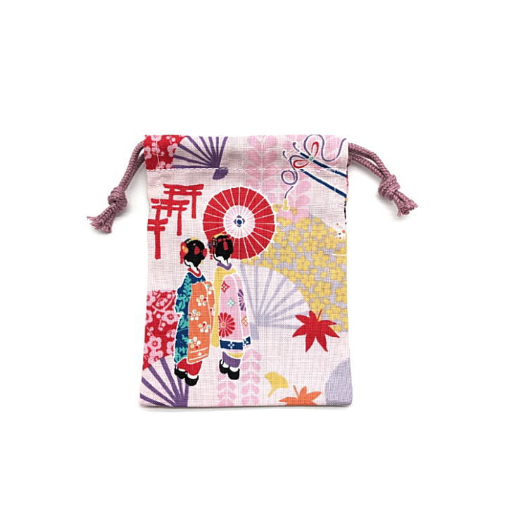 超ミニ巾着袋・SSS袋(11cm×8cm)【和柄 舞妓さん柄 ピンクパープル】巾着 ポーチ お守り袋 小物袋 お菓子袋 小さい袋 プリント マチ無し 両絞り 日本製 和雑貨 和小物 海外土産 プレゼント 可愛い コットン生地 綿 イヤホン リップ 化粧品 鍵 飴袋 しだれ桜 扇子 紅葉 花
