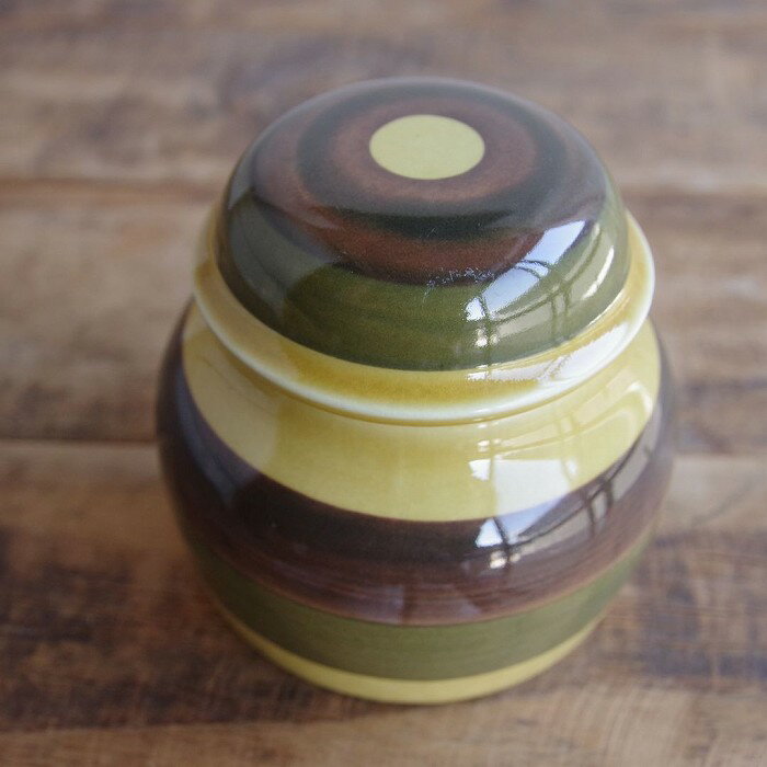 ノルウェーの陶磁器メーカー Stavangerflint のシュガーポットです。 グリーンがかったブラウンの釉薬がかけられており、 ブラウンやグリーンのラインが描かれています。 全体的に丸みのある形がかわいらしい、レトロなデザインです。 1960~70年代ごろのものと思われます。 【状態について】 底面 高台部分に小さなカケが一か所あります。 そのほかは、特に目立つチップやヒビはありません。 蓋の部分に少し擦り傷があります。 そのほか、わずかな擦り傷はあるかと思いますが、 全体として傷は少なく、ツヤがあり、ヴィンテージ品としてはとてもきれいな状態です。 製品本来の品質として、ちょっとした釉薬むらや黒点、不整形等はある場合があります。 詳細は写真にてご確認ください。 --- ■サイズ: 高さ約 9cm ※ 写真に写りこんだデコレーション等はお届け内容に含まれません。
