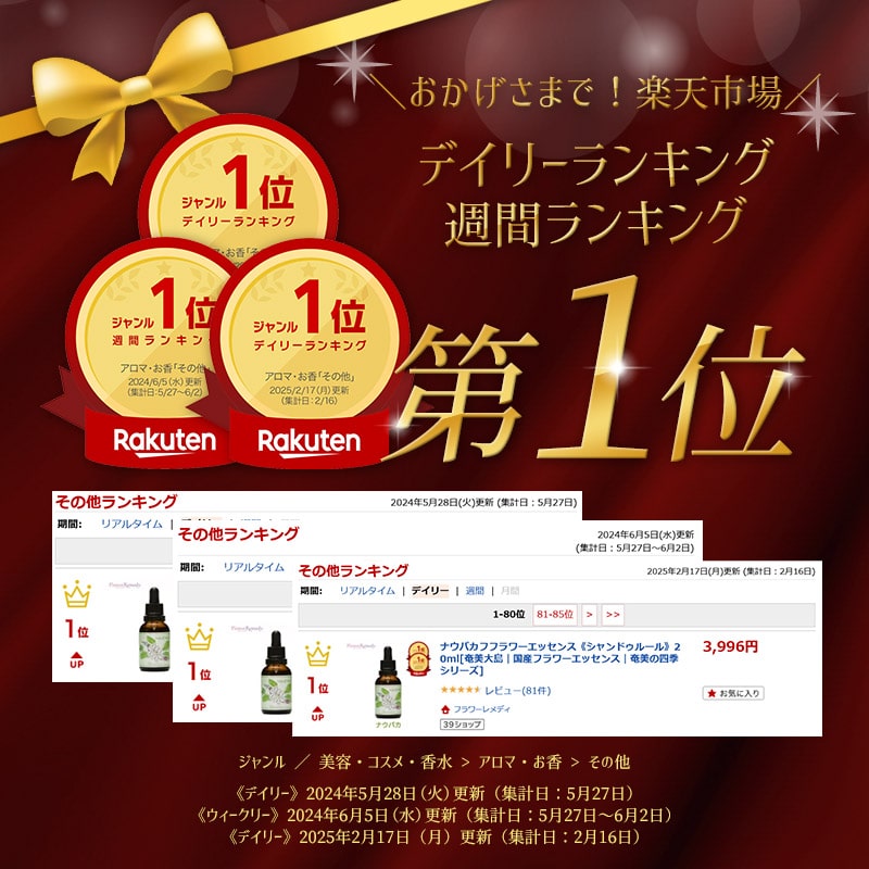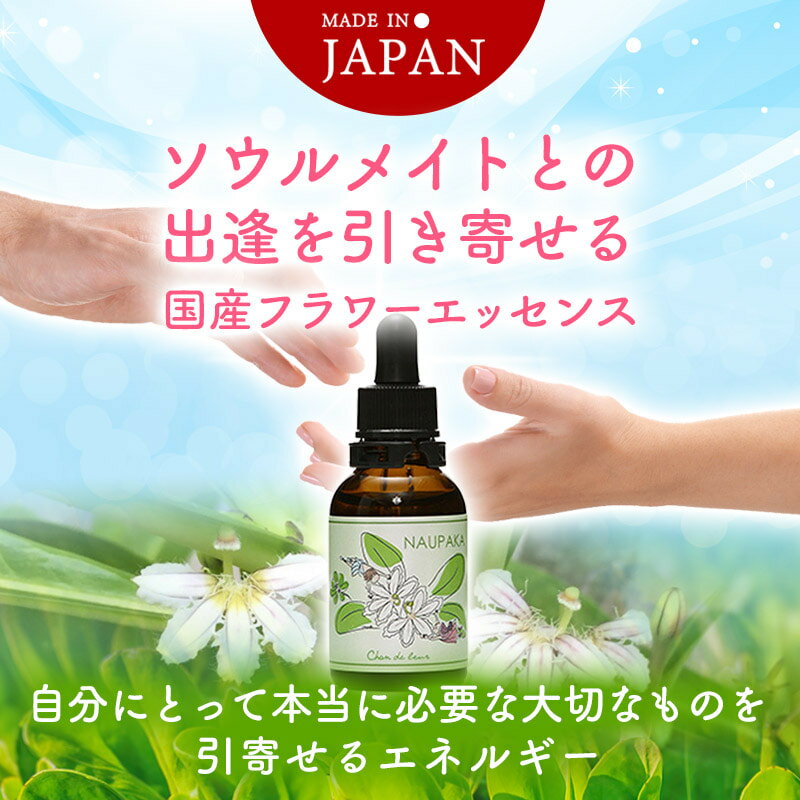 より良い商品をお客様へお届けするために、より多くのお客様の声を伺いたいです。 ぜひ、レビューを書いて頂けたらと思います。 商品ご購入後、商品のレビューをご記入いただいた方全員に 次回のお買い物で使える「1ヵ月間ずーっと500円OFF」クーポンを差し上げます! レビューご記入はとっても簡単です!下記のリンクよりご確認下さい。 ※商品レビューの書き方ナウパカは2つに引き裂かれ、半分しか咲かない花として、大切なものを引き寄せるエネルギーがあります。人や物、情報など新たなご縁を生み出します。ナウパカに秘められた大切なご縁を繋ぐ、引寄せのエネルギーをお楽しみください。ナウパカの神話から今でもこの花は、半分の花を咲かすことしかできず、この2つのナウパカを合わせると、2人の魂に導かれ、恋人達はきっと結ばれると言われています。ボトルのラベルに描かれているのは、海と山、それぞれの花の妖精が再会している姿です。 ☆こんなあなたにおすすめです! ・必要な情報やご縁を引き寄せたい ・自分の中にある本当の気持ちに繋がりたい ・自分の価値観や目的を明確にしたい ・新たな環境でものごとをスタートしたい ・ソウルメイトに出逢いたい ☆特長とメリット ・会いたい人とのご縁が繋がりやすくなります ・欲しかった情報や環境、物事などと繋がりやすくなります ・自分の気持ちが明確になり、進むべき方向性が見えてきます ・自分の中にある深い感覚と繋がるようになります ・求めていた新たなスタートが切れるようになります ・気持ちが明るくハッピーで入れらます ・ソウルメイトや大切なご縁を引き寄せます ☆店長の一言アドバイス 会いたいと思っていた人とのご縁が繋がったり、やりたかった仕事が入って来たり、必要な情報が手に入ったりする引寄せのエネルギーの一方で、自分自身にフォーカスすると、自分の中で迷っていたことに答えが出たり、もうひとりの自分をみつけたり、自分らしさを取り戻したりと、自己変容のプロセスにも繋がります。 ☆商品の使い方 1回4滴を舌下に直接たらして、1日4回を目安にお飲みください。少量のコップの水やハーブティーなどに4滴たらして、お飲みいただくこともできます。スプレーボトルにミネラルウォターとエッセンスを数滴入れ、アロマオイルでお好きな香りを付けることもできます。(お部屋や枕、ご自身のオーラなどにスプレーして使います。)フラワーエッセンスを手に取り、チャクラや気になる部分に刷り込んでお使いください。ジェルやオイルなどに入れてマッサージするのもお勧めです。フラワーエッセンスをバスタブのお湯の中に入れて入浴します。浴室中がエッセンスのエネルギーに包まれるので全身でエッセンスを受け取ることができます。 商品仕様 内容量:20ml 原材料:ナチュラルミネラルウォーター、植物性グリセリン、花抽出エキス(ナウパカ) 原産国:日本 製造元:(株)シャンドゥルール 保存方法 ボトルに記載してある日付は未開封の場合の消費期限となります。常温保存でOKですが、直射日光の当たらない冷暗所に保管して下さい。PCや冷蔵庫など電化製品の電磁波をなるべく避けましょう。誤飲防止のため、乳幼児・ペットの手の届かに場所に保管ください。 2本セットもあります! ナウパカフフラワーエッセンス 2本セット《シャンドゥルール》 フラワーエッセンス&アロマの外用スプレー! ナウパカフフラワーエッセンススプレー《シャンドゥルール》25ml フラワーレメディ公式You Tubeチャンネル シャンドゥルールフラワーエッセンスの使い方動画 動画でシャンドゥルールのフラワーエッセンスとスプレーの使い方を解説していますのでご覧ください。
