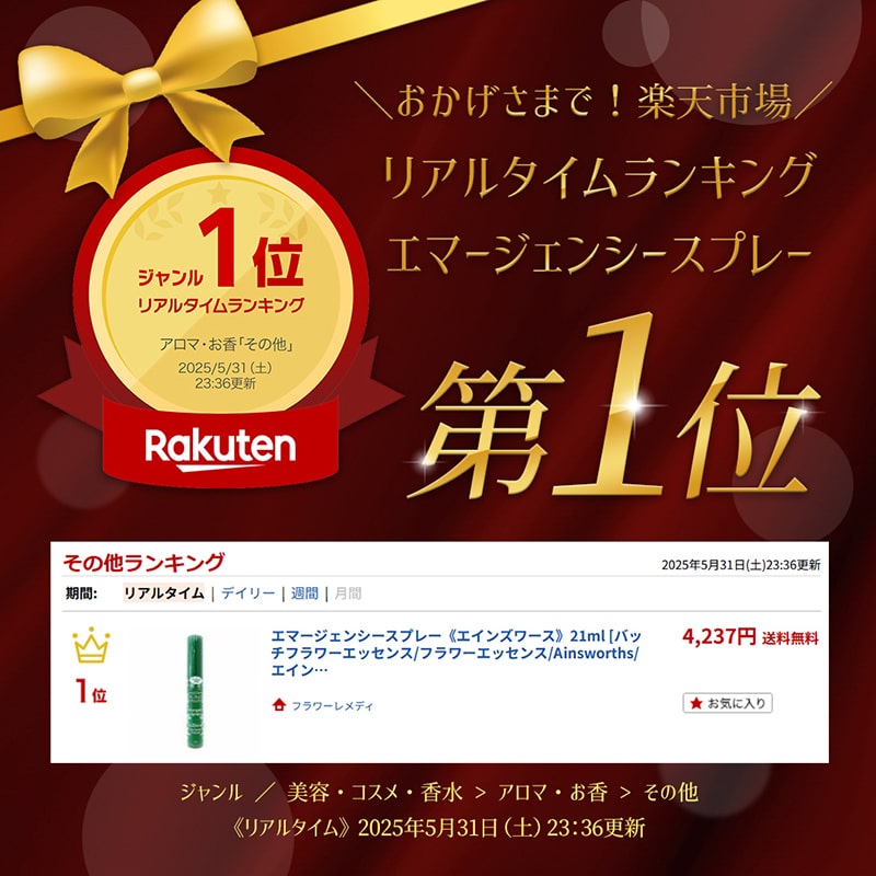 バッチフラワーエッセンスの中で、落ち着き・緩和・強化作用があることで知られているエッセンスを使用して特別に調合して作りました。 この独自のフォーミュラは、バッチ博士オリジナルの「レスキューレメディ」に、恐れと不安と負の連鎖を起こす思考を助けるアスペン、ミムラス、ホワイトチェストの3種類のエッセンスを加えたものです。 エマージェンシースプレーは、バッチフラワーのコンビネーションをすぐに使用できるスプレータイプにした商品です。天然素材でアルコールフリーですので、頻繁に使用しても安全であり、赤ちゃんを含めたあらゆる年齢層の方にご使用いただけます。 ☆こんなあなたにおすすめです ・ストレスに満ちた状況の最中もしくはその前(事前に予測される時)。例:面接時、重要な会議、試験、医療機関での診療時、等 ・緊張状態の時、バランスを崩した時、感情面でのプレッシャーを感じている時 ・リラックス状態を高めたい時、瞑想時 ・赤ちゃんや子供や動物が不安な状態の時 ・朝の起床時と夜の就寝前に 商品仕様 ブランド名:エインズワース 内容量:21ml 原材料:水・植物グリセリン・グレープフルーツシードエキス・フラワーエッセンス 原産国:イギリス 製造元:エインズワース 注意事項 ・デザインが変更になる場合がございます。予めご了承ください。 ・本品は化粧品や医薬品ではありません。 ・効果は個人によって異なり、特定の効果を保証するというものではありません。より良い商品をお客様へお届けするために、より多くのお客様の声を伺いたいです。 ぜひ、レビューを書いて頂けたらと思います。 商品ご購入後、商品のレビューをご記入いただいた方全員に 次回のお買い物で使える「1ヵ月間ずーっと500円OFF」クーポンを差し上げます! レビューご記入はとっても簡単です!下記のリンクよりご確認下さい。 ※商品レビューの書き方