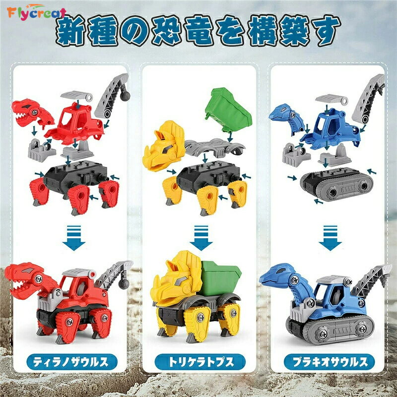 【3+1恐竜建設車両セット】ショベル ーティラノザウルス、 ダンプトラックートリケラトプス, クレーン ブラキオサウルス、電動ドライバー 翼竜 、手動ドリル* 1(ご注意:電気ドリルを稼働には単四電池*2本が必要です。電池は別売りとなります。)パーツを変える事で4つのバリエーションを楽しめるも。子どもたちは自分の想像力と興味に応じて新種の恐竜を構築するふりをすることができます。 【組み立てが簡単 】付属の詳細マニュアル、各ステップには詳細なグラフィックの説明があります。互換性と変形、恐竜トラックのすべての部分はあなたが好きなように変更して互換性を持たせることができます。顔や胴体、手や足もそれぞれ3体と組み合わせ自由なので、ヴェロキラプトルの胴体にトリケラトプスの顔をつけたり、ティラノザウルスの足をつけたりすることが可能です。創造力豊かなお子様の、お好みの新種の恐竜を作ってみてください! 【STEM・知育おもちゃ】自分で考えて組み立てるので、知育玩具としてとても優秀、手や指先の練習ができます。これで子供が思い切って想像力を発揮して遊べます。子供の右脳開発、手眼調和、認識能力、創造力などを向上させるだけでなく、集中力などを高めます、はお子様の手先が器用になる能力を鍛えさせ。 【最適なプレゼント】誕生日、子供の日、クリスマス、その他の休日、または子供のパーティーに最適です。質の高いプラスチック材料を作られ、ご安心ください。滑らかな表面とエッジのデザイン、遊び中に子供が引っかいてしまうのを防ぎます。水洗いも安心。(電動ドリルの水洗いはご遠慮ください。故障の原因になります。)部品を口に入れないように、 大人は傍に見守ってください。対象年齢:6歳以上! 【注意事項】:・当店でご購入された商品は、原則として、「個人輸入」としての取り扱いになり、中国からお客様のもとへ直送されます。 ・通関時に関税・輸入消費税が課税される可能性があります。 ・課税額はご注文時には確定しておらず、通関時に確定しますので、商品の受け取り時に着払いでお支払いください。詳細はこちら ご確認下さい。 ・個人輸入される商品は、全てご注文者自身の「個人使用・個人消費(日本に居住する者に寄贈される物で、当該寄贈を受ける者の個人的な使用に供される場合を含みます。)」が前提となります。 第三者への譲渡・転売が法令で禁止されるもの(医薬品、医薬部外品、化粧品等を含みますが、これに限られません。)もございますのでご注意下さい。 ・一部商品は国内の提携先倉庫から配送されます。 ・国内配送の商品は国内でのお買い物と同じく消費税が発生いたします。関税はかかりません。 *色がある場合、モニターの発色の具合によって実際のものと色が異なる場合がある。