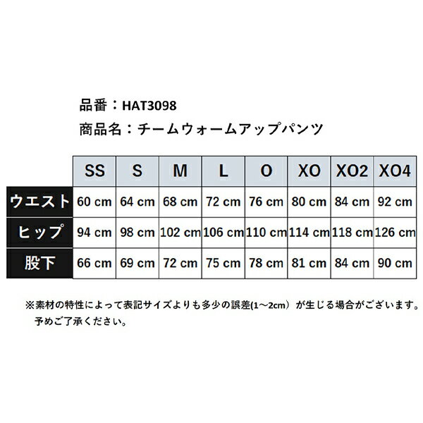 スリムシルエットになったチームにもオススメのウォームアップパンツです。 シェブロンラインはテープ仕様! ※こちらの商品はメーカーお取り寄せとなります。 発送までに通常3-7日ほどお時間を頂きます。 【素材】 ポリエステル92%・ポリウレタン8% 【カラー】 20:レッド 26:クラレット 63:ロイヤルブルー 71:インディゴネイビー 90:ブラック 【サイズ】 SS:ウエスト60cm/ヒップ94cm/股下66cm S:ウエスト64cm/ヒップ98cm/股下69cm M:ウエスト68cm/ヒップ102cm/股下72cm L:ウエスト72cm/ヒップ106cm/股下75cm O:ウエスト76cm/ヒップ110cm/股下78cm XO:ウエスト80cm/ヒップ114cm/股下81cm XO2:ウエスト84cm/ヒップ118cm/股下84cm XO4:ウエスト92cm/ヒップ126cm/股下90cm
