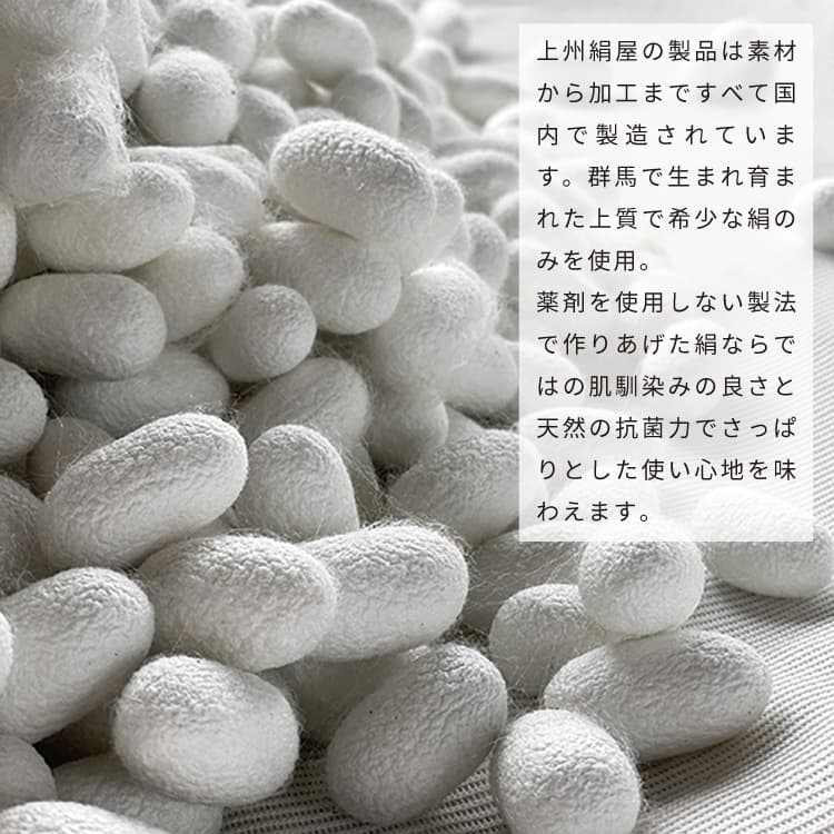 上州絹屋 セリシンボディタオル 空気層を含んだ構造とシャリ感が特徴。 天然タンパク質「セリシン」を含む網状生糸を使用したボディタオル 特殊な方法で繭から製糸された網状生糸を使用。空気層を含んだ構造とシャリ感が特徴です。コシとボリュームがあり、さっぱりと洗いあげます。 タオルと肌を濡らしやさしく撫でるように使います。空気層を含んだ構造によって石けんが程よく泡立ち、網状の生地ですっきりと洗えます。 上州絹屋の製品は素材から加工まで全て国内で製造しています。 群馬県で生まれ育まれた上質で希少な絹のみを使用。 薬剤を使用しない製法で作りあげた絹ならではの肌馴染みの良さと天然の抗菌力(*)でさっぱりとした使い心地を味わえます 国産の蚕で20年以上 蚕の餌である桑を国内で収穫。 本社敷地内の蚕室で「ぐんま200」という品種に絞って養蚕しています。 蚕は4度の脱皮を繰り返し、ようやく繭を作り始めます。 天候によって温度管理を細かく調整し、桑を食べさせ始める時期を揃えるなど手間暇かけて飼育しているからこそ、 不良率が低くて、均等な大きさで良質な繭が作られます。 安心安全のために 薬剤を一切使用せずに洗浄するため、繭に含まれる天然のタンパク質「セリシン」を多く残したまま仕上げることができます。 製糸(繭から糸にする)の時、繊維がほぐれやすくするために繭を煮立てます。 煮立てた繭は非常に腐りやすく、カビなどが生えやすいため、 通常ホルマリンや防腐剤が使用されますが、上州絹屋の原料は薬剤を使用せず製糸されていますので、 安心安全にお使いいただけます。 絹の力 繭から生まれた天然タンパク質「セリシン」は、 人間の皮膚に組成が近い「セリン」というアミノ酸が豊富に含まれているため、 肌馴染みも良く、保湿・保護・美白・抗酸化作用に優れたスキンケア成分として注目されています。 ●保湿効果:保湿性が非常に高いセリンを含むセリシンの効果で、お肌に浸透して潤いを保ちます。 ●UV吸収機能:セリシンには人の体に有害であるとされる波長(200~300nm)の紫外線の透過率を抑える効果があります。 ●抗酸化作用:セリシンが持つ活性酸素の働きを抑える力で、シワやシミ・ソバカスなどの原因となるチロシナーゼを阻害します。 絹糸の構造 1本の絹糸は2本の「フィブロイン」とその周りを取り囲む「セリシン」という2種のタンパク質で構成されています。 ●セリシン:精錬(アルカリ処理)で取り除かれるタンパク質で、天然のスキンケア成分を多く含みます。 セリシンの残っている生糸は、ピンとした張りと硬さがあり、柔らかさと光沢はありません。 ●フィブロイン:精練後に残るアミノ酸物質。精練によりセリシンが除去されると、 三角断面が光を乱反射して絹特有の深みのある光沢が出ますが、スキンケアの有効成分が失われます。 品名 上州絹屋 上州絹タオル ブランド 上州絹屋 カラー/型番 JSKNT004 カラー/サイズ/重さ 幅25 x 高さ85 (cm) 材質 絹 100% 生産国 日本(群馬県) 知っておいていただきたいこと ・製品仕様は、予告なく変更することがあります。 ・閲覧されている環境により、若干色味が違って見える場合がございます。予めご了承ください。 ・ご使用前には、必ず説明書をお読みの上、ご利用くださいませ。 ・お客様による誤ったご利用による故障や破損は、保証対象外となります。上州絹屋 セリシンボディタオル 空気層を含んだ構造とシャリ感が特徴。 天然タンパク質「セリシン」を含む網状生糸を使用したボディタオル 特殊な方法で繭から製糸された網状生糸を使用。空気層を含んだ構造とシャリ感が特徴です。コシとボリュームがあり、さっぱりと洗いあげます。 タオルと肌を濡らしやさしく撫でるように使います。空気層を含んだ構造によって石けんが程よく泡立ち、網状の生地ですっきりと洗えます。 上州絹屋の製品は素材から加工まで全て国内で製造しています。 群馬県で生まれ育まれた上質で希少な絹のみを使用。 薬剤を使用しない製法で作りあげた絹ならではの肌馴染みの良さと天然の抗菌力(*)でさっぱりとした使い心地を味わえます 国産の蚕で20年以上 蚕の餌である桑を国内で収穫。 本社敷地内の蚕室で「ぐんま200」という品種に絞って養蚕しています。 蚕は4度の脱皮を繰り返し、ようやく繭を作り始めます。 天候によって温度管理を細かく調整し、桑を食べさせ始める時期を揃えるなど手間暇かけて飼育しているからこそ、 不良率が低くて、均等な大きさで良質な繭が作られます。 安心安全のために 薬剤を一切使用せずに洗浄するため、繭に含まれる天然のタンパク質「セリシン」を多く残したまま仕上げることができます。 製糸(繭から糸にする)の時、繊維がほぐれやすくするために繭を煮立てます。 煮立てた繭は非常に腐りやすく、カビなどが生えやすいため、 通常ホルマリンや防腐剤が使用されますが、上州絹屋の原料は薬剤を使用せず製糸されていますので、 安心安全にお