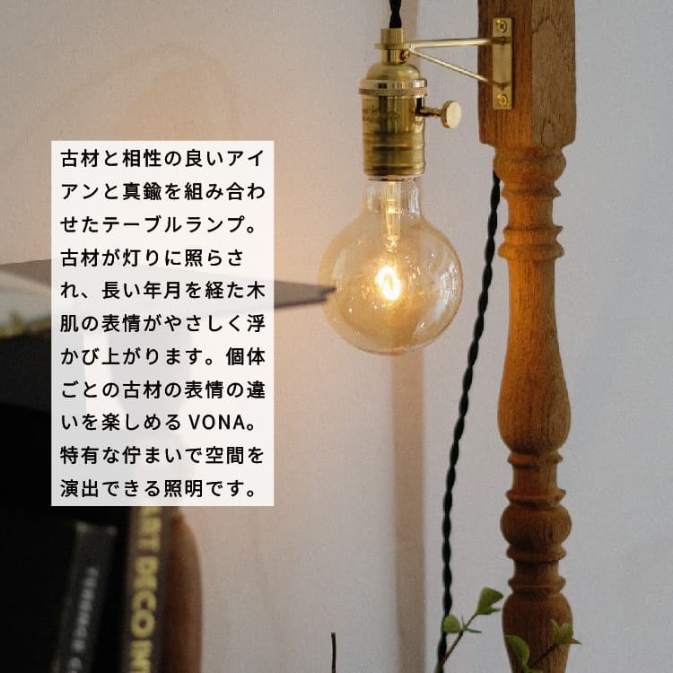 VONA wooden spindle TABLE LAMP │WEST VILLAGE TOKYO(ウエストビレッジ) VONA(ボナ)テーブルランプは、天然の古材・アイアン・真鍮を組み合わせた、インテリア性の高い間接照明です。置くだけでお部屋の雰囲気をぐっと上質に引き上げます。 ■ 建材としての役目を終えた古材×アイアン×真鍮素材のテーブルランプ VONAは、建材としての役割を終えた古材をアイアンと組み合わせ、新たなインテリアとして提案するシリーズです。らせん細工の独特なカービング、ひとつひとつ異なる表情や特別感ある佇まいが特徴です。魅力を最大限に引き立てるため、手作業で加工されています。 ■ インテリアの印象を変える素材の存在感 木の質感、手作りの温度、真鍮の重厚感。素材そのものの魅力が合わさることで、照明でありながら、家具としての存在感を持つランプに仕上がっています。明かりを灯さない時でも絵になる佇まいは、空間に深みを与える特別なアイテムです。 ■ 天然木の温もりを感じる間接照明 温もりのある木の風合いと、真鍮パーツの落ち着いた輝きが調和した、クラシックなデザインのスタンドライトです。アイアンの土台は安定感と見た目のバランス、どちらも大切にデザインされています。 ■ 表情が異なる個性で、一点物としての価値を楽しむ 職人の手で一本一本仕上げられたハンドメイド品。木目・節・色味・傷・形状に個体差があるのが魅力で、同じものは二つとありません。 ■ 使いやすいロータリースイッチ&E26電球対応 ソケット部分は回して操作するロータリースイッチ式。カチっと回してON/OFFの切り替えができます。クラシックなデザインと真鍮の質感が古材と好相性です。E26口金の電球に対応し、お好みの明るさや雰囲気にカスタマイズできます。※電球は別売りです ■ どこに置いても馴染む、程よい存在感 高さ64cmの設計は、コンパクトながらも空間のアクセントに最適。リビング・玄関・寝室・カウンター・デスクライトとして幅広く活躍します。アンティーク風、ヴィンテージ風、インダストリアル、ナチュラル、ブルックリン、カフェ風など、さまざまなテイストに馴染むデザイン。ショップでの店舗什器としてもおすすめのテーブルライトです。 ■ こんなシーンにおすすめ ・ベッドサイドの間接照明として柔らかい灯りが欲しい方・リビングや玄関に、雰囲気のあるライトを置きたい方・カフェ・ショップ・サロンのディスプレイ照明として・木製家具、真鍮雑貨、アイアンと組み合わせて統一感を出したい方・アンティーク風、ヴィンテージ風インテリア、ナチュラル家具との組み合わせに・VONA wooden spindleシリーズがお好きな方 【ご購入前にご確認ください】 ・本製品はすべて手作業による一点物のため、木材の色合いや状態、施盤細工の形状には個体差がございます。商品の特性としてご理解いただき、唯一無二の表情をお楽しみください。■商品ページ下部の注意事項、画像の注意事項をご確認の上、ご購入をお願いいたします。 商品名 VONA wooden spindle TABLE LAMPボナ ウッデンスピンドル テーブルランプ ブランド WEST VILLAGE TOKYO / ウエストビレッジトーキョー サイズ 約 幅20×奥行14×高さ64 (cm)※各サイズはおおよその大きさで、商品には個体差がございます コード 全長:195 (cm)上部固定部分からコンセントプラグまで:170 (cm) 素材 天然木、アイアン、真鍮 対応電球 E26・MAX40w※電球は付属しておりません 原産国 タイ JAN 4589824367224 知っておいていただきたいこと 【●ご購入前にご確認ください●商品の特徴や個体差について】■本製品は見た目や木材の状態の個体差がとても大きく、古材を使用しているためそれぞれが一点物です。同じ物はございません。■古材やアイアンの特徴も商品特性としてあらかじめご了承の上、ご購入をお願い致します。■ご購入時に、古材やらせん細工の形状・木材の状態・色味・表情等、アイアンの状態を、お選び頂くことはできません。※本製品は建材として使われていた長い古材を切り出して使用しているため、個体によりデザインが異なります。※記載サイズと実際の商品サイズが異なる場合がございます。表記サイズはおおよその大きさで、個体差がございます。※同じ商品でも切り出した位置により、施盤細工の形状、模様、色味、表情がひとつひとつ異なり、同じ物のない一点ものとなります。※反り、割れ、虫食い跡、節抜けの穴、塗装跡、欠け、変色、穴や凹み等があるものもございますが、古材の特性としてご理解ください。※ご使用環境により木材に反りや割れが出てくることがございます。湿度の変化によるものは天然木の特性です。※アイアンパーツは、鉄素材を塗装をせず、素材の持ち味を活かした、クリア塗装のみの仕上げとなっております。お届け時点でサビが出ている場合や、溶接個所や研磨痕のある場合がございますが、素材の特徴としてご理解ください。--※こちらの商品はギフト包装対象外です。※閲覧されている環境によ