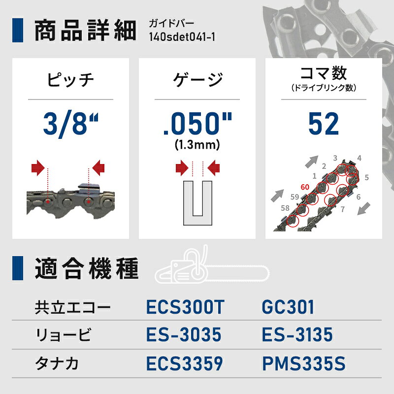 ※商品説明 本商品はガイドバーのみです。 DSガイドバー140SDET041になります。 ※オレゴンなど他社ブランド商品ではありません。 以下、商品詳細になります。 バーサイズ 14インチ (35cm) 適合チェーン 3/8“ピッチ・.050ゲージ(1.3mm) 適合チェーンタイプ91タイプ52コマ 91VXL052E、91PX052E、91PX52E モーターマウントT041 ※お使いのチェーンソーの規格をご確認の上、使用してください <適応機種の一例> ※掲載の機種でもチェーンピッチ、バーの長さが異なる機種もあります。 ※お使いのチェンソーが「14インチバー使用」「91タイプ52コマのチェーン使用」を必ず確認してください 共立エコー ECS300T ECS300TPS ECS300W GC301 GC302 GC302PS GC305 GC306 GC306PS GC330T GC331T ECS352A GC35 GC351 GC35A GC33T 日立 CS35EC3,CS35EC3(S) CS35EC2(S) CS35ED2,CS35ED2(S) CS35ED3,CS35ED3(S) リョービ ES-3035 ES-3135 タナカ ECS3359 ECS3359S PMS330A PMS335S TCS3359S パワーメイト PMS330A PMS330S PMS335A PMS335S 丸山 CSR310S 注意事項:モニター発色の具合により、実物とは色合いが異なる場合がございます。対応ソーチェーンはこちら 91PX-52E対応 1本入