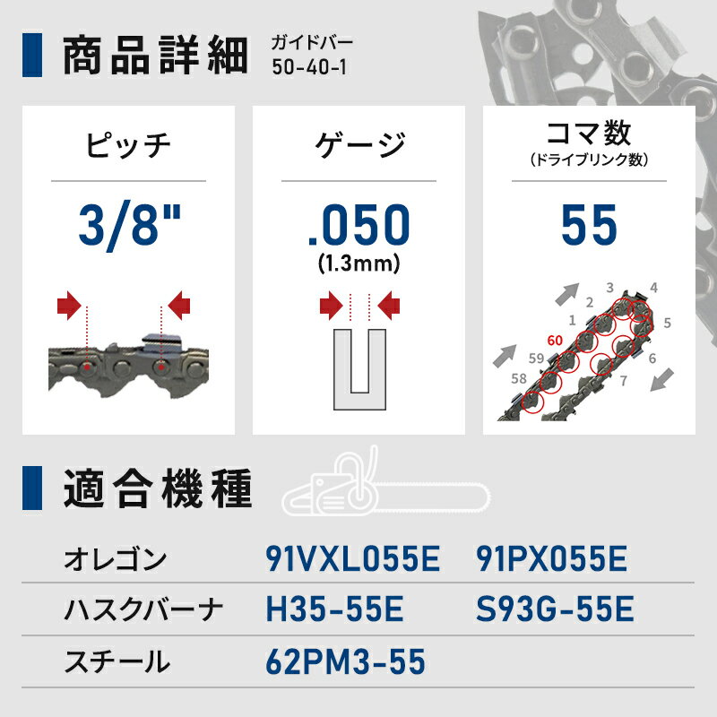 ※商品説明 本商品はガイドバーのみです。 DSガイドバー50-40になります。 ※オレゴンなど他社ブランド商品ではありません。 以下、商品詳細になります。 バーサイズ 16インチ (40cm) 適合チェーン 3/8“ピッチ・.050ゲージ(1.3mm) 適合チェーンタイプ91タイプ55コマ 91VXL055E、91PX055E、91PX55E モーターマウントA074 互換性のあるオレゴンガイドバー:160SDEA074 ※お使いのチェーンソーの規格をご確認の上、使用してください <適応機種の一例> ※掲載の機種でもチェーンピッチ、バーの長さが異なる機種もあります。 ※お使いのチェンソーが「16インチバー使用」「91タイプ55コマのチェーン使用」を必ず確認してください。 スチール MS200 MS211C MS230 MS241 MS250 MS250C 注意事項:モニター発色の具合により、実物とは色合いが異なる場合がございます。対応ソーチェーンはこちら オレゴン91PXー55E対応 1本入