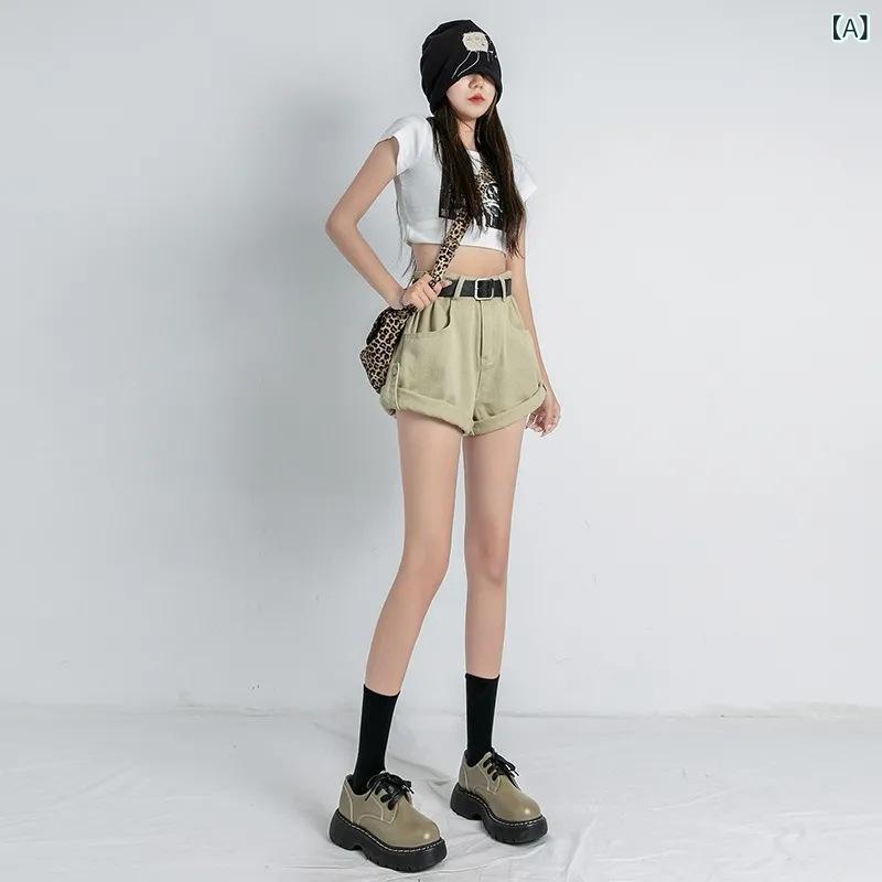 レディース ショートパンツ ハイウエスト デニム 夏用 薄手 ミリタリーグリーン カラキ ホワイト ピンク 綿 ポリエステル ストレート 膝上丈 ポケット 巻き丈 復古風 Aライン スリム ワイドレッグ カジュアル 快適 洗い加工 軽量 普段使い 通勤