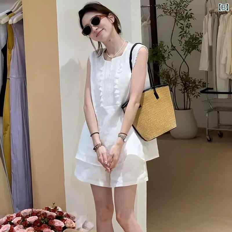 レディース 無袖 上衣 夏 セット 女性用 高腰 ワイドパンツ ショートパンツ 2点セット 純色 クロップドパンツ 花辺 加工 快適 休閑 スタイル ネイビー ベージュ イエロー カラー 展開 軽量 素材 吸湿速乾 機能 通勤 普段使い 対応 ビッグシル