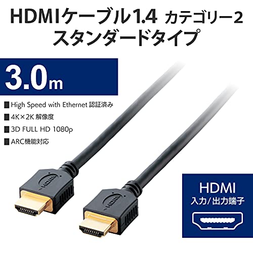 3.0m・1) HDMIケーブル単品 3m DH-HD14ER30BK・・Size:3mColor:1) HDMIケーブル単品・最大4K(3840×2160px)/30Hz、Full HD(1920×1080px)/120Hzの解像度に対応しております。・色深度は従来の24bit(Full Color:フルカラー)から、30/36/48bit(Deep Color:ディープカラー)まで対応し、より豊かな色表現が可能です。・サビなどに強く信号劣化を抑える金メッキピン・金メッキプラグを採用しています。・外部ノイズの干渉から信号を保護する3重シールドケーブルを採用しています。・コネクター部にもノイズを軽減する金属シェルコネクターを採用しています。説明 【 仕様 】 ■対応機種:HDMI(タイプA・19ピン)側:HDMI入力端子を持つ液晶テレビ・プラズマテレビ・プロジェクター等、HDMI(タイプA・19ピン)側:HDMI出力端子を持つAV機器・ゲーム機等 ■規格:High Speed HDMI Cable with Ethernet (HDMI 1.4a)認証 ■コネクター形状1:HDMIプラグ(タイプA・19ピン) ■コネクター形状2:HDMIプラグ(タイプA・19ピン) ■ケーブルタイプ:スタンダード ■伝送速度:10.2Gbps ■対応解像度:最大4K(3840×2160px)/30Hz、Full HD(1920×1080px)/120Hz ■シールド方法:3重シールド ■プラグメッキ仕様:金メッキピン・金メッキプラグ ■ケーブル長:約3m ※コネクター含む ■ケーブル太さ:約5.8mm ■カラー:ブラック 【 説明 】 ■最大4K/30Hzの解像度に対応したHDMIケーブルです。High Speed HDMI Cable with Ethernet認証の取得により、安定した映像信号と音声信号の伝送を実現しています。 ■1本のケーブルで、映像信号と音声信号をデジタルのままで高速伝送するだけでなく、イーサネット信号の双方向通信を実現します。 ■100Mbpsのイーサネット通信を実現する、HEC(HDMIイーサネットチャンネル)に対応しています。 ■デジタル音声をテレビなどの表示機器からAVアンプなどの出力機器へ伝送できる、ARC(オーディオリターンチャンネル)に対応しています。 ■最大4K(3840×2160px)/30Hz、Full HD(1920×1080px)/120Hzの解像度に対応しております。 ■色深度は従来の24bit(Full Color:フルカラー)から、30/36/48bit(Deep Color:ディープカラー)まで対応し、より豊かな色表現が可能です。 ■サビなどに強く信号劣化を抑える金メッキピン・金メッキプラグを採用しています。 ■外部ノイズの干渉から信号を保護する3重シールドケーブルを採用しています。 ■コネクター部にもノイズを軽減する金属シェルコネクターを採用しています。 ■外部ノイズの影響を受けにくい、ツイストペア構造を採用しています。 ■EUの「RoHS指令(電気・電子機器に対する特定有害物質の使用制限)」に準拠(10物質)しています。 【商品に関するお問い合わせ】 エレコム総合インフォメーションセンター TEL. 0570-084-465 FAX. 0570-050-012 受付時間 / 10:00~19:00 年中無休
