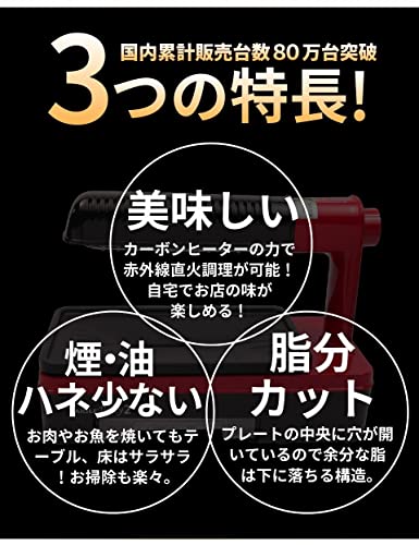 ・Red ・上部+下部のダブル加熱。余熱時間が従来のモデルの半分に!・炭火のように赤外線を出すカーボンヒーターを熱源に利用することで、煙を抑え美味しさを引き出します。・風味豊かな焼調理だけでなく「鳥の唐揚げ」や「ハンバーグ」 等のノンフライ調理が可能です。・嫌な煙を抑えて調理ができ、食材を素早く加熱できる両面加熱でおいしい料理を仕上げます。・上部のみ加熱モードなら、さらに煙・油ハネが低減します。余熱時間が従来のモデルの半分。お手入れ簡単。ノンフライ調理が可能。 食材を素早く加熱できる両面加熱。 原産国:中国