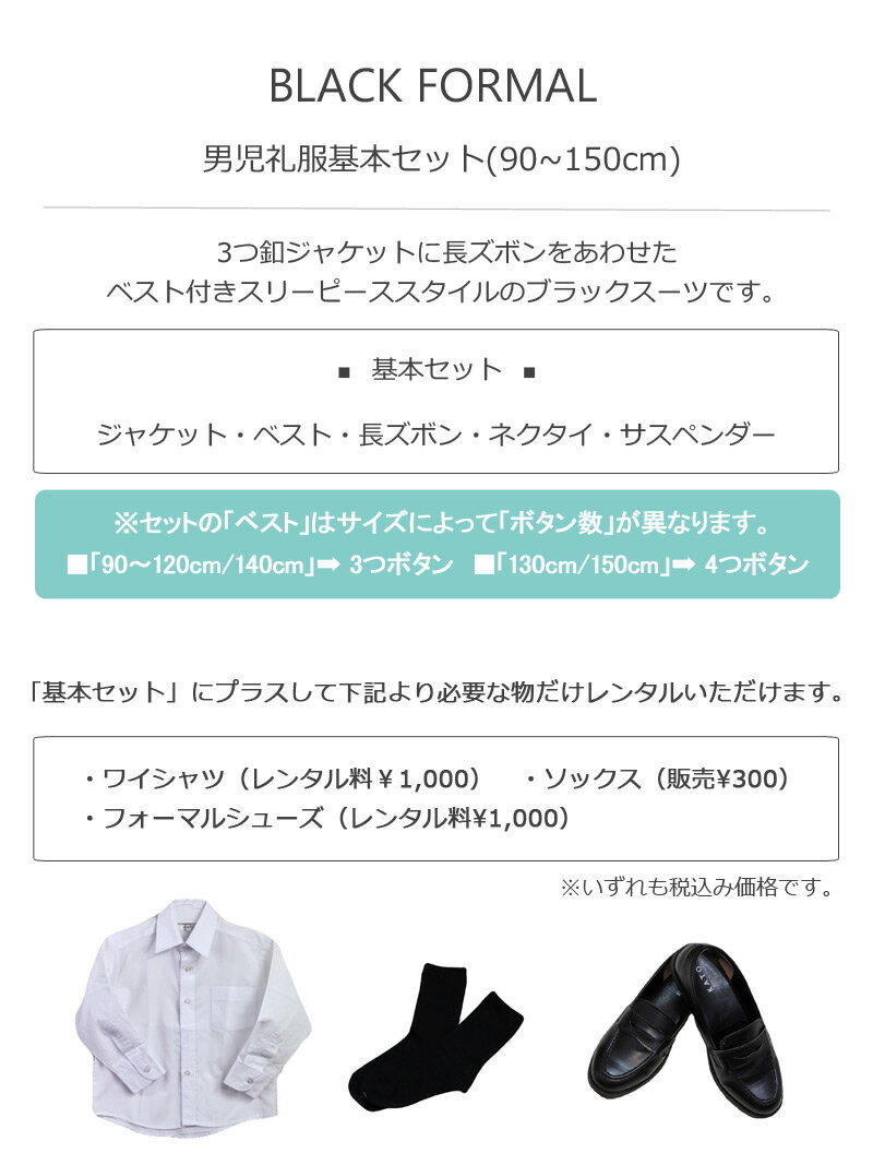 お買い物前にお読みください。 当商品はレンタル商品です。 レンタル期間は3泊4日となります。 ご利用日の2日前までにお手元に届くようヤマト宅急便またはゆうパックにて発送。ご返却は3泊4日以内に商品といっしょにお届けした着払い伝票にて、ご発送ください。 レンタル状況によりレンタル不可となる場合がございます。ご注文が成立されても、時間差でご注文が重複する場合がございますので、当店よりの「ご注文商品確保」のメールが届くまでは正式にレンタル確定とはなりませんので、ご注意ください。 PC版でのみレンタル状況、ご利用規約がご確認いただけます。 詳しくは「ご利用ガイド」にてご確認ください。★喪服レンタル★・男の子【往復送料無料】 ★ブラック/スリーピース ベスト付き3つボタンジャケット男の子喪服★90cm~150cm ジャケット・ベスト・ズボンのみのセット(ネクタイ・サスペンダー付き) ワイシャツ・シューズ・ソックスは付属しておりません。 商品画像のお色は、お使いのモニターによって多少異なって見える場合がございます。ご了承くださいませ。 商品仕様 color ブラック 仕様 ■ジャケット:3つボタン・胸元と左右腰部にポケットあり ■ベスト:左右にポケット ■パンツ:前ファスナー・後ろはゴム入り・裾に長さ調節用のマジックテープ付き ※ベストのボタン数はサイズによって異なります。 ■「90cm~120cm / 140cm 」> 3つボタン ■「130cm / 150cm」> 4つボタン 素材 ポリエステル100% セット内容 ジャケット・ベスト・ズボン・ネクタイ・サスペンダー フォーマルシューズについて デザイン・メーカーにより、ご指定いただいたシューズサイズと異なるサイズをお送りする場合がございます。大きいサイズをお届けする場合はインソールをお付けいたします。 商品到着後、どうしてもサイズが合わない場合はサイズ交換いたしますので、ご連絡ください。 なお、サイズ変更により生じます追加の送料は、お客様ご負担とさせていただきます。 サイズ詳細 サイズ表に表示されておりますサイズは、商品そのものにメジャーを当てて採寸したものです。身長サイズはあくまで目安ですので、お子様の実寸から多少のゆとりを持ってお選びください。日ごろ大きめサイズの普段着をご着用のお子様も、実際の身長に近いサイズでのご検討をおすすめいたします。 ★喪服レンタル★・男の子【往復送料無料】 ★ブラック/3ピース 男の子喪服★ レンタル衣装ご予約状況カレンダー ○・・・レンタル可能 ×・・・レンタル不可 【ご予約状況は下記のご希望サイズをクリックしてご確認ください。】 90cm 100cm 110cm 120cm 130cm 140cm 150cm ※当店のレンタル商品は、年間を通しレンタル対応していることから、「レンタル不可」の場合でもご注文できるシステムとなっております。当店からの「商品確保」のメールが届くまでは正式にレンタル確約ではございませんので、ご注意ください。 > 【販売】シンプルな子供クルーソックス・黒