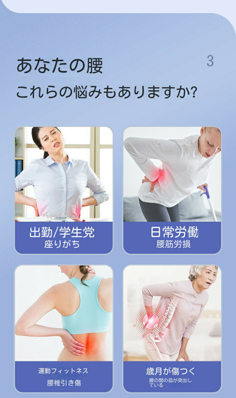 自然重力式 腰椎リラックスサポーター製品の主な特徴 ■ 独自のアーチ型設計で自然に腰を伸ばす 人の腰のカーブにフィットする形状で無理なくストレッチ。 横になるだけで重力を利用し、腰椎を優しく伸ばします。 日々の緊張やコリを自然に解放し、腰周りの筋肉をほぐします。 ■ 4段階調節で好みの強さにカスタマイズ 「軽め」モードで初めての方も安心。 「やや強め」でじっくりケア。 日常使いに最適な「中程度」。 しっかりケアが必要な方は「最強」モード。 ■ 座りながら・寝ながらの2WAY使用 床で仰向け、椅子で座りながらも使用可能。 デスクワーク中でも姿勢を整え、腰への負担を軽減します。 ■ 3Dマッサージポイントで深くほぐす 表面の微小突起で指圧のような刺激を再現。 筋肉の深部までアプローチし、血行促進・疲労回復をサポート。 ■ 高耐久 & 体に優しい素材 環境配慮型ABSポリウレタン採用。 耐荷重80kg(板厚5mm)、柔らかく快適な使い心地。 ■ コンパクト設計で収納&持ち運び簡単 サイズ:幅36.5cm × 奥行24.5cm × 高さ17.5cm。 リビング・寝室・オフィスどこでも使用可能。こんなお悩みのある方におすすめ 長時間のデスクワークで腰が重い方。 運動後の筋肉の張りが気になる方。 年齢とともに腰の調子が気になる方。 日頃から姿勢が悪いと言われる方。 手軽にセルフケアで腰のメンテナンスをしたい方。平らな場所に本品を置き、ゆっくり仰向けに寝ます。 腰を自然に預け、リラックス。 起き上がる際は横向きになり、手で体を支えてゆっくり姿勢を戻してください。 ※急な動作は腰を痛める原因になります。ご自宅・オフィスで手軽にできる腰ケア 一日の終わりや仕事の合間に、この一本でゆったりとした時間をお楽しみください。検索キーワード例 腰椎リラックスクッション 腰椎サポート 腰痛対策 クッション 腰椎伸展 クッション 椎間板ヘルニア対策 デスクワーク用クッション 姿勢矯正 腰椎マッサージ 3Dバイオニックマッサージ ポリウレタン製クッション 高耐久クッション コンパクトクッション 腰痛緩和 長時間座る用クッション 健康グッズ リラックスクッション 自宅用クッション オフィス用クッション ストレッチクッション 重力腰伸ばし 腰椎ケア用品 高齢者用クッション 運動後ケア 腰痛改善 腰負担軽減 マッサージポイント付き自然重力式 腰椎リラックスサポーター製品の主な特徴 ■ 独自のアーチ型設計で自然に腰を伸ばす 人の腰のカーブにフィットする形状で無理なくストレッチ。 横になるだけで重力を利用し、腰椎を優しく伸ばします。 日々の緊張やコリを自然に解放し、腰周りの筋肉をほぐします。 ■ 4段階調節で好みの強さにカスタマイズ 「軽め」モードで初めての方も安心。 「やや強め」でじっくりケア。 日常使いに最適な「中程度」。 しっかりケアが必要な方は「最強」モード。 ■ 座りながら・寝ながらの2WAY使用 床で仰向け、椅子で座りながらも使用可能。 デスクワーク中でも姿勢を整え、腰への負担を軽減します。 ■ 3Dマッサージポイントで深くほぐす 表面の微小突起で指圧のような刺激を再現。 筋肉の深部までアプローチし、血行促進・疲労回復をサポート。 ■ 高耐久 & 体に優しい素材 環境配慮型ABSポリウレタン採用。 耐荷重80kg(板厚5mm)、柔らかく快適な使い心地。 ■ コンパクト設計で収納&持ち運び簡単 サイズ:幅36.5cm × 奥行24.5cm × 高さ17.5cm。 リビング・寝室・オフィスどこでも使用可能。こんなお悩みのある方におすすめ 長時間のデスクワークで腰が重い方。 運動後の筋肉の張りが気になる方。 年齢とともに腰の調子が気になる方。 日頃から姿勢が悪いと言われる方。 手軽にセルフケアで腰のメンテナンスをしたい方。平らな場所に本品を置き、ゆっくり仰向けに寝ます。 腰を自然に預け、リラックス。 起き上がる際は横向きになり、手で体を支えてゆっくり姿勢を戻してください。 ※急な動作は腰を痛める原因になります。ご自宅・オフィスで手軽にできる腰ケア 一日の終わりや仕事の合間に、この一本でゆったりとした時間をお楽しみください。検索キーワード例 腰椎リラックスクッション 腰椎サポート 腰痛対策 クッション 腰椎伸展 クッション 椎間板ヘルニア対策 デスクワーク用クッション 姿勢矯正 腰椎マッサージ 3Dバイオニックマッサージ ポリウレタン製クッション 高耐久クッション コンパクトクッション 腰痛緩和 長時間座る用クッション 健康グッズ リラックスクッション 自宅用クッション オフィス用クッション ストレッチクッション 重力腰伸ばし 腰椎ケア用品 高齢者用クッション 運動後ケア 腰痛改善 腰負担軽減 マッサージポイント付き自然重力式 腰椎リラックスサポーター製品の主な特徴 ■ 独自のアーチ型設計で自然に腰を伸ばす 人の腰のカーブにフィットする形状で無理なくストレッチ。 横になるだけで重力を利用し、腰椎を優しく伸ばします。 日々の緊張やコリを自然に解放し、腰周りの筋肉をほぐします