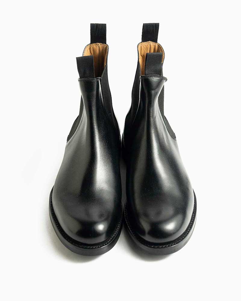 ギフトラッピングのお申し込みはこちらから - ブランド - クロケット&ジョーンズ - 詳細 - CHELSEA 21 素材:カーフ(牛革) 色:BLACK CALF(ブラックカーフ) ソール:ダイナイトソール ラスト:394 フィッティング:E Made in England - 説明 - - チェルシー 21 - クロケット&ジョーンズは、その長い歴史の中で木型や素材、ソールを変化させることによってスマートでエレガントなスタイルからカジュアルなカントリースタイルまで、様々なチェルシーブーツ(サイドゴアブーツ)をリリースしてきました。 「チェルシー21」はボリューミーなラウンドトゥによる愛嬌のあるフォルムを持つ【ラスト394】を採用。 英国靴ではあまり見かけないハイトを高くリクエストしたブーツで、鼻筋がスッと通った精悍な顔付きに仕上げています。 足入れの際に不可欠なプルストラップは通常、後方にしか付きませんが、前方と後方の両方に付け、ストラップへの指入れをスムーズにする為、通常より長めに設定しています。 細かな点ですが、日本の脱ぎ履き習慣に寄り添ったディテールです。全天候型のブーツとして、ハルボロ・ラバー社が新たに改良を加えたニューダイナイトソールを採用。 素材の配合率を見直し、柔らかさ、グリップ力、屈曲性が向上したことで足の返りが良く、歩行の快適さをサポートしてくれます。 さらに、ストームウェルトではなく、フラットウェルトを採用することでソール周りはボリュームを抑えた印象に仕上げています。アッパーには上質なブラックカーフ素材を採用。 - LAST394 - 第二次世界大戦時、C&Jは英国軍が将校向けに支給していたオフィサーシューズを生産していた歴史を持ちます。 当時、そのオフィサーシューズには、やや短めのノーズに厚みのあるつま先、しっかりと丸みを効かせたラウンドトゥを持つ【ミリタリーラスト210】が使われていました。 2024年、新たにリリースされた【ラスト394】は、つま先周辺を含む前方のフォルムはミリタリーラスト210をそのまま同じに踏襲し、ヒールカップ(踵部)をややタイトに絞って踵のフィットを向上させたアップデートモデルです。 ミリタリーラストの魅力であるぽってりとした高さのあるラウンドトゥや懐古的なフォルムは継承しつつ、履いた時のフィット感は現代的にアレンジされています。 ご試着の際に履き皺や傷等がついてしまったものにつきましては、ご返品、交換を承ることができませんので、以下の事にご注意の上、サイズをご確認下さいます様お願い致します。 ・室内(カーペットやラグ等の上)でご試着下さい。 ・足入れの際は必ず靴べらをご使用下さい。 ・つま先を曲げない(かかとを上げない)様、ご注意ください。 ※ 特にアッパー部分は皺が入りやすいため、十分にご注意下さい。 - キーワード - #Crockett&Jones/#クロケット&ジョーンズ/#boots/#sidegore/#サイドゴア/#CHELSEA21/#チェルシー21/#カーフ/#メンズ/#ブラックカーフ/#suede/#LAST394/#dainitesole/#牛革/#イギリス製/#送料無料/#代引き手数料無料/クロケット&ジョーンズ【Crockett&Jones】CHELSEA 21(ブラックカーフ)ダイナイトソールMen's Collection