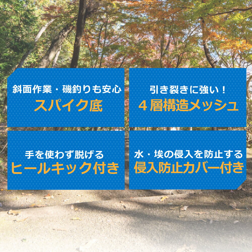 スパイクジョイ#5 商品詳細 ■スパイク付きソールで地面をしっかりとらえる ■4層構造メッシュで強度UP ■埃や雨、泥の侵入を防ぐ侵入防止カバー付き ■夜間の視認性をアップするリフレクター(反射材)装備 ■使いやすい位置のヒールキック付き ■取り外しができるEVAインソール入り 仕様 ■カラー:ネイビー ■サイズ:S(24.0-24.5)、M(25.0-25.5)、L(25.5-26.0)、LL(26.5-27.0)、3L(27.5-28.0) ■重量:(片足)約800g(Lサイズ) ■ウィズ:3E ■素材:(アッパー)天然ゴム+合成ゴム、(ソール)天然ゴム+合成ゴム ■生産国:中国