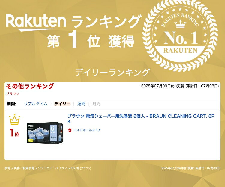 商品の特徴 ・99.9%除菌 ・刃を自動的に潤滑化 ・ほのかなレモンの香りでリフレッシュ ・最大30回の洗浄が可能 ・全てのブラウンアルコール洗浄システム付き製品に装着可能 商品の詳細 ブラウン独自のアルコール洗浄*で、毎日新品のような剃り心地 ブラウンのアルコール洗浄液は、洗浄、潤滑化を、専用の洗浄システム機器にセットしてボタンひとつで行います。 この洗浄システムを利用してシェーバーを洗浄した場合、水道水で洗浄するよりも約10倍も衛生的になることが実証済みです。 アルコール洗浄システムを定期的に使用したあとの優れた深剃りに150人以上の消費者が納得。さらに、110人を超える消費者が、剃り心地が改善したと答えています**。 除菌洗浄:99.9%除菌。ヒゲくずもしっかり洗い落とします。定期的に洗浄を行なうことで、最高の衛生状態を維持。毎日、新品のような使い心地をお楽しみいただけます。 潤滑化:刃を自動的に潤滑化し、上質な剃り味を保ちます。 リフレッシュ効果:ほのかなレモンの香り。毎日爽快なシェービングが可能になります。 洗浄回数:毎日のご使用で最大30回の洗浄が可能です。 素材・材質:エチルアルコール(94%) 対応機種:全てのブラウンアルコール洗浄システム付き製品に装着可能。セットしておけば自動で充電とクリーニングができる、ブラウン独自の全自動洗浄システム「クリーン&チャージ」専用のカートリッジです。 ※アルコール素材ですので、少しずつ蒸発します。毎日ご使用にならない場合でも約8週間での交換をおすすめします。 *試験機関:INSTITUT FRESENIUS、 試験方法:アルコール洗浄システム後の刃部の除菌率を測定 **P&G調べ 関連商品【1等100%ポイントバック! ※要エントリー】ブラウン シリーズ5 ...【1等100%ポイントバック! ※要エントリー】カークランドシグネチャ...【1等100%ポイントバック! ※要エントリー】システマ ランチ プラ...6,363円4,582円4,600円【1等100%ポイントバック! ※要エントリー】カークランドシグネチャ...【1等100%ポイントバック! ※要エントリー】オッタビオ グレープシ...【1等100%ポイントバック! ※要エントリー】ツヴィリング 赤ワイン...4,671円4,966円4,340円【1等100%ポイントバック! ※要エントリー】カークランドシグネチャ...【1等100%ポイントバック! ※要エントリー】ピュリティ プレミアム...【1等100%ポイントバック! ※要エントリー】KUZEFUKU&SO...5,119円5,101円4,439円【1等100%ポイントバック! ※要エントリー】テスコム プロテクトイ...【1等100%ポイントバック! ※要エントリー】ダウニー アンストッパ...【1等100%ポイントバック! ※要エントリー】カークランドシグネチャ...4,849円5,110円4,466円